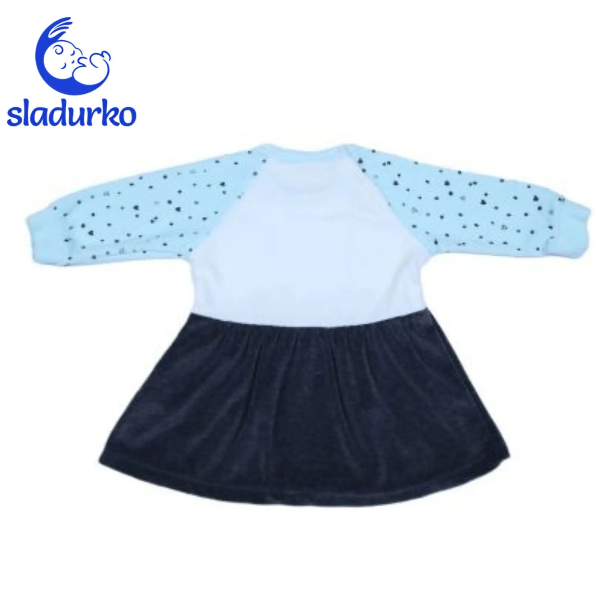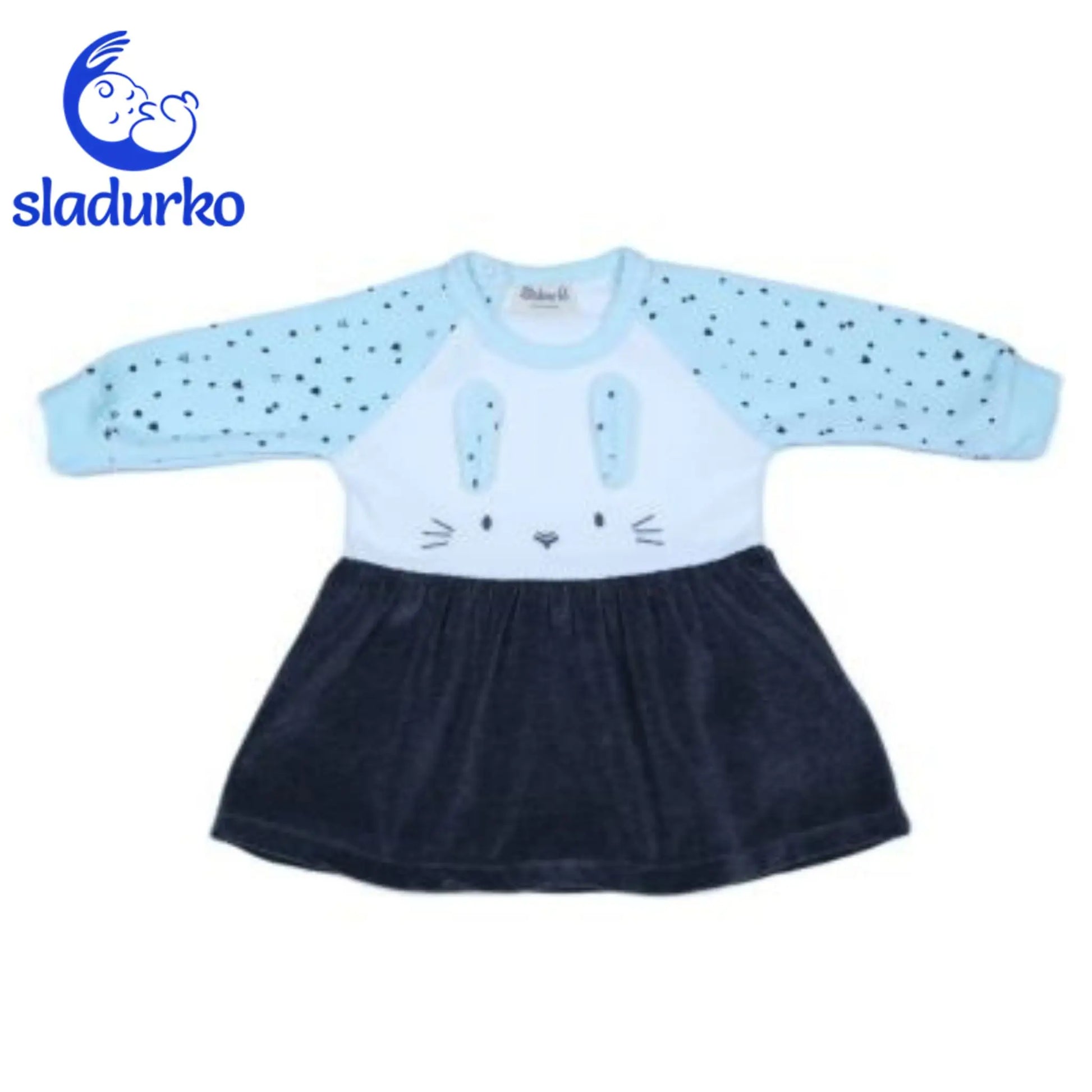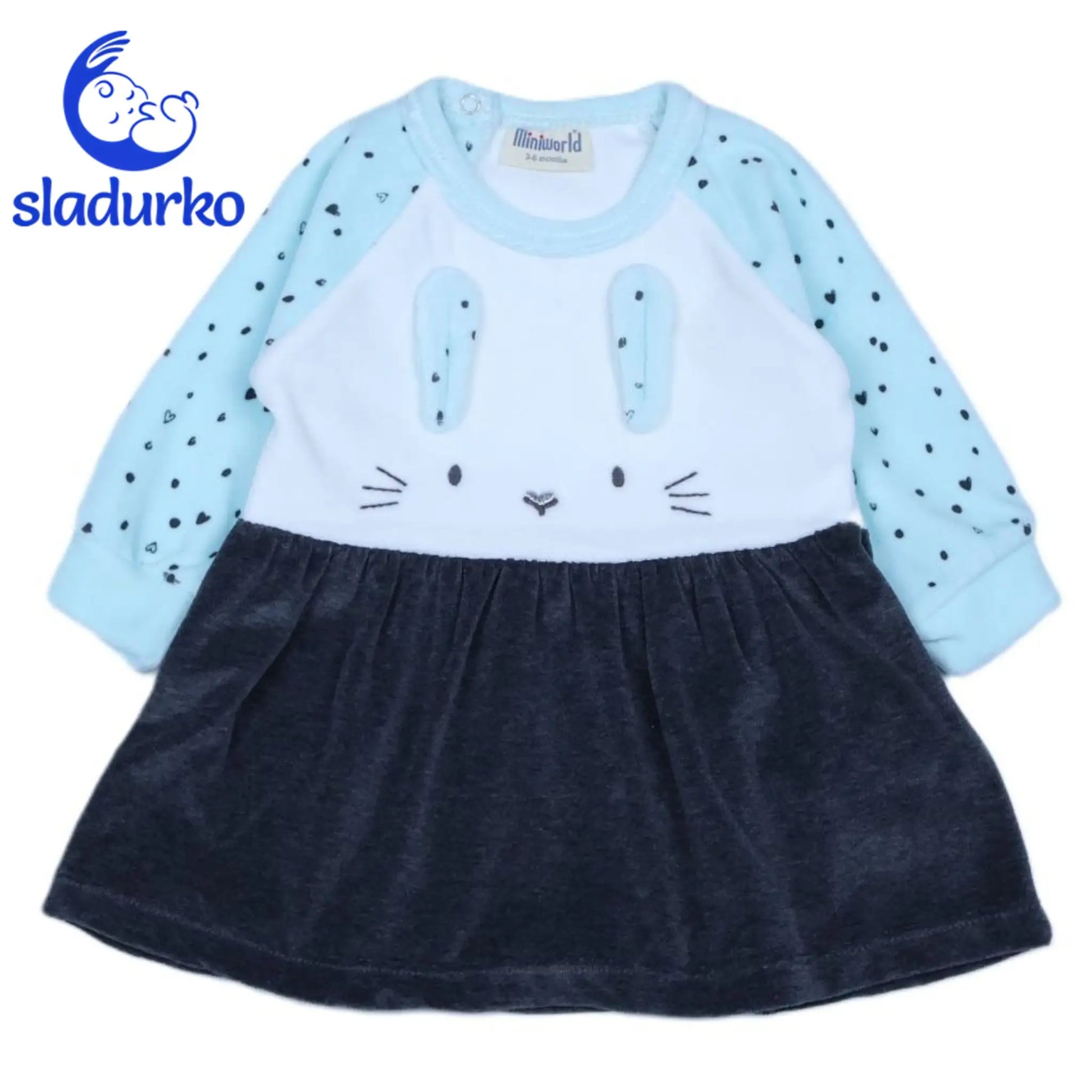 Тази очарователна плюшена рокля е идеална за малките момиченца, които обичат да се чувстват уютни и сладки. Горната част на роклята е бяла и е украсена с 3D уши на зайче, които придават на роклята игрив и забавен вид. Долната част на роклята е тъмно сива и е изработена от мек и пухкав материал, който ще държи детето ви топло и удобно през целия ден. Ръкавите на роклята са светло зелени и са украсени с малки сиви точки, които придават на роклята още повече очарование.