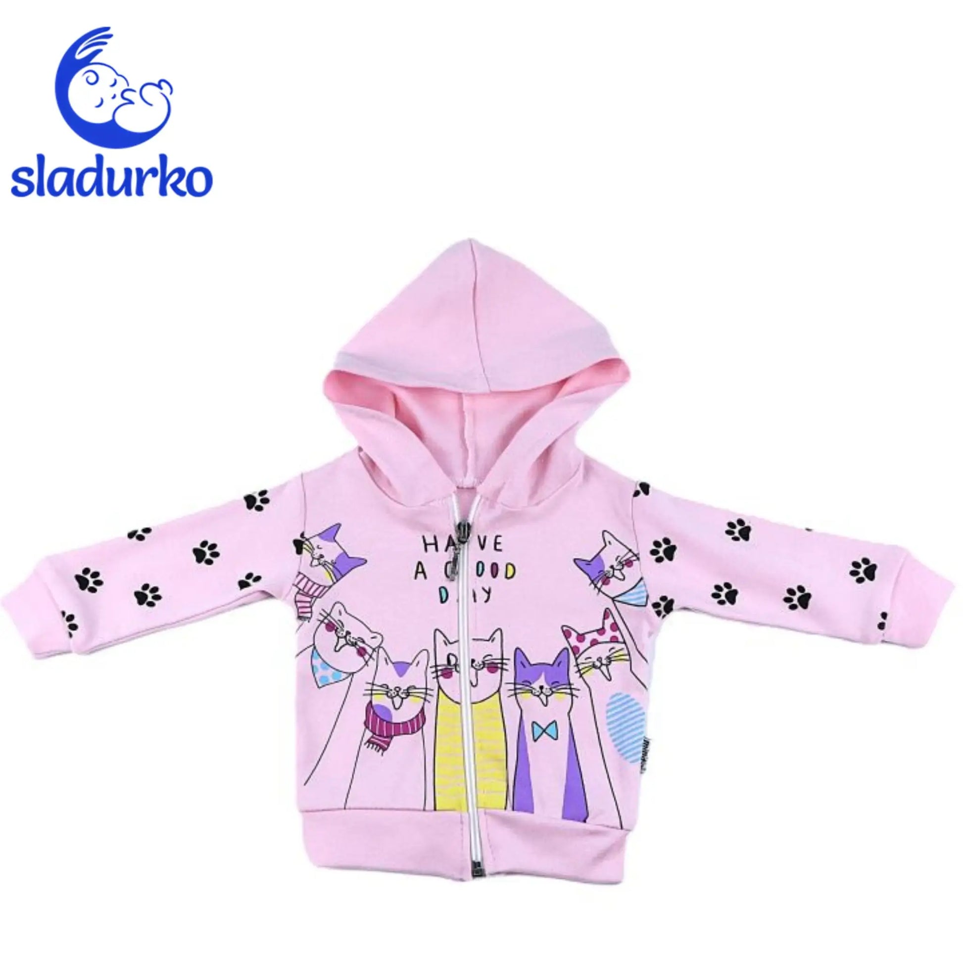 - Суичер с качулка и цип: Декорирано с цветен принт на забавни котета с шалчета и панделки, както и надпис "Have a good day!".