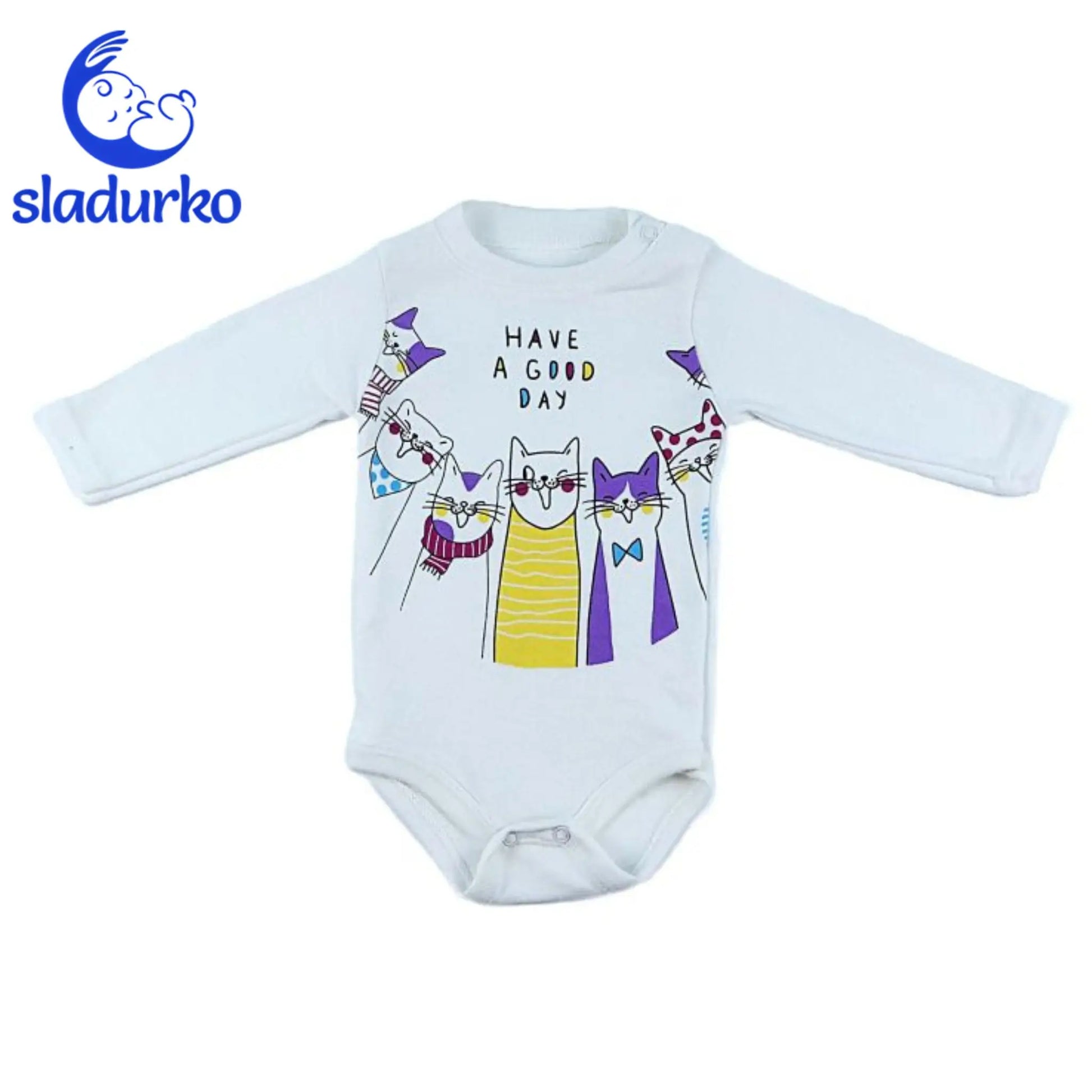 - Боди с дълъг ръкав: Бяло боди с дълъг ръкав и удобно закопчаване с тик-так копчета между крачетата.