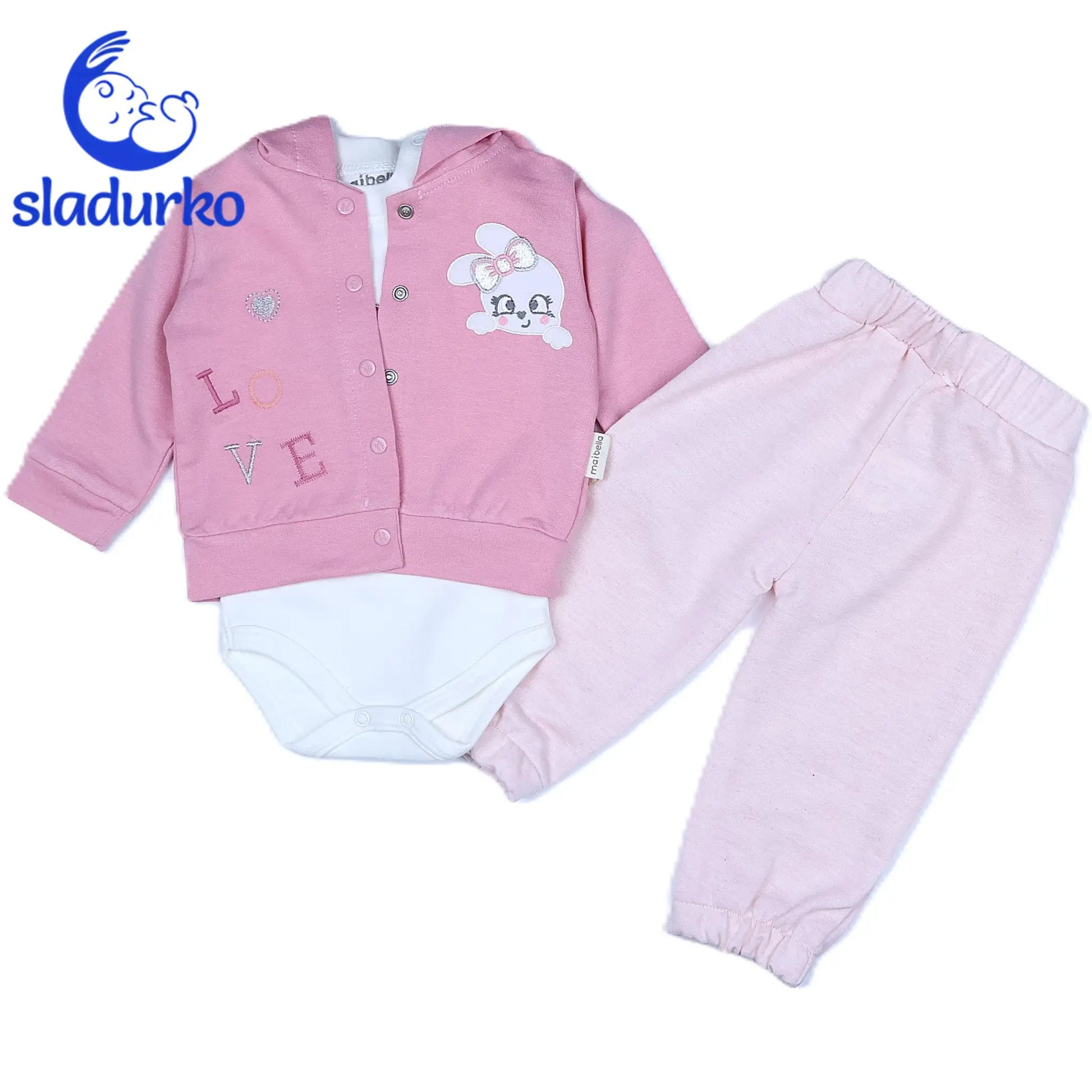 100% памук. Суитчер с качулка и тик так копчета, боди с тик так копчета на рамото и от долу, панталонки с ластик на колана и на крачолите.