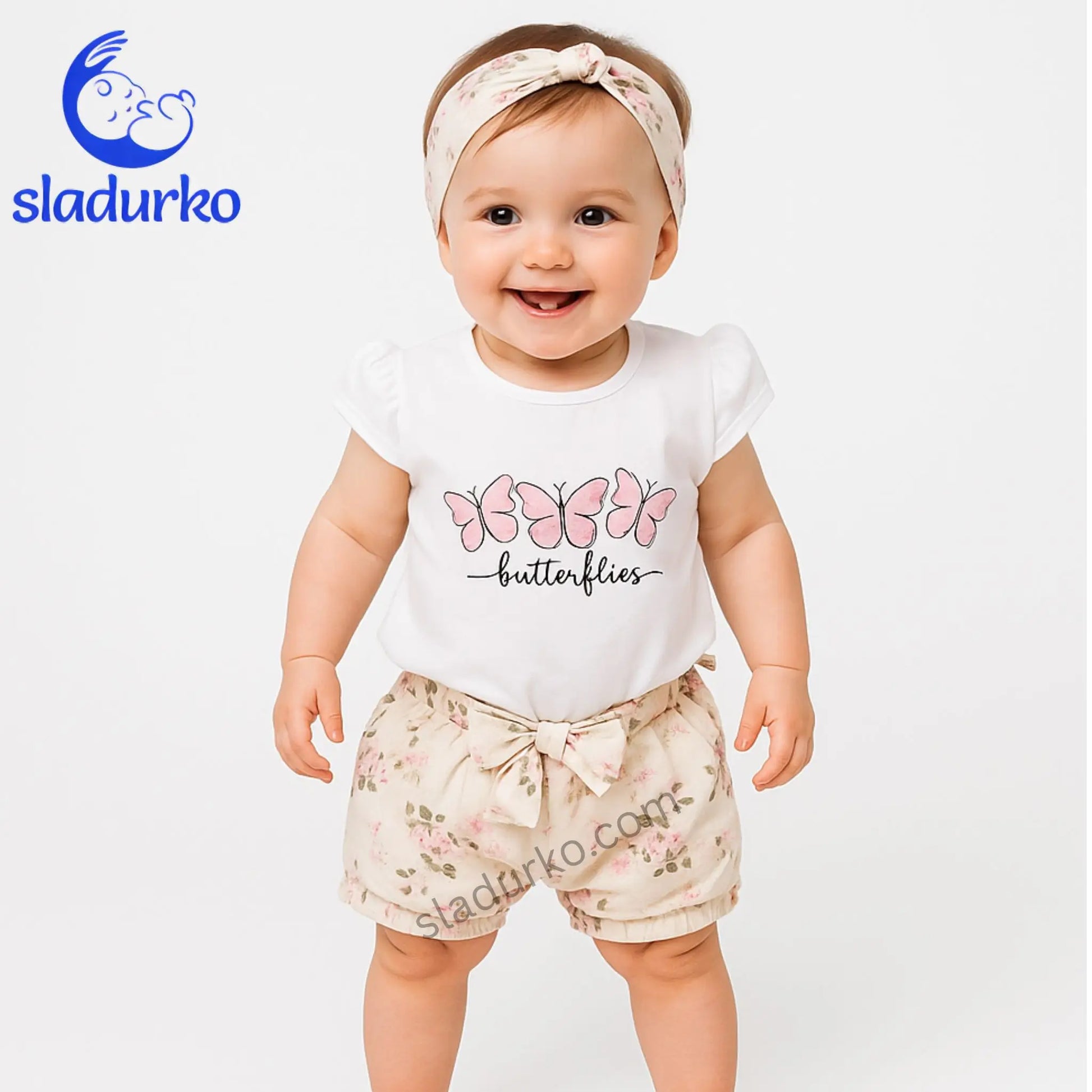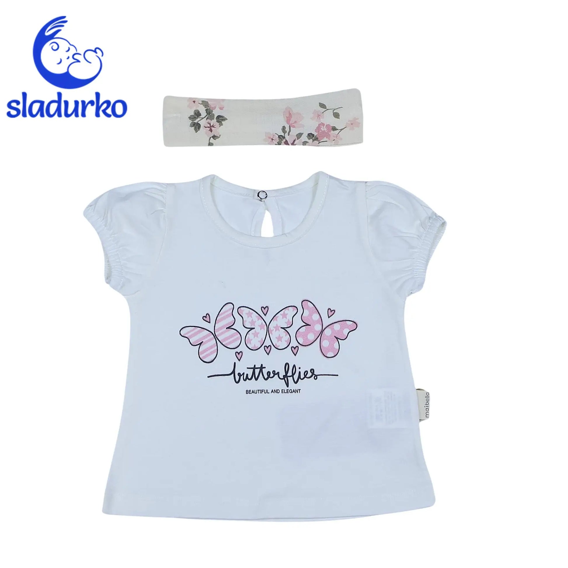 - Тениска: Бяла тениска с къс ръкав и апликация на три нежни пеперуди с надпис "butterflies". Закопчаване с копчета на гърба за лесно обличане.