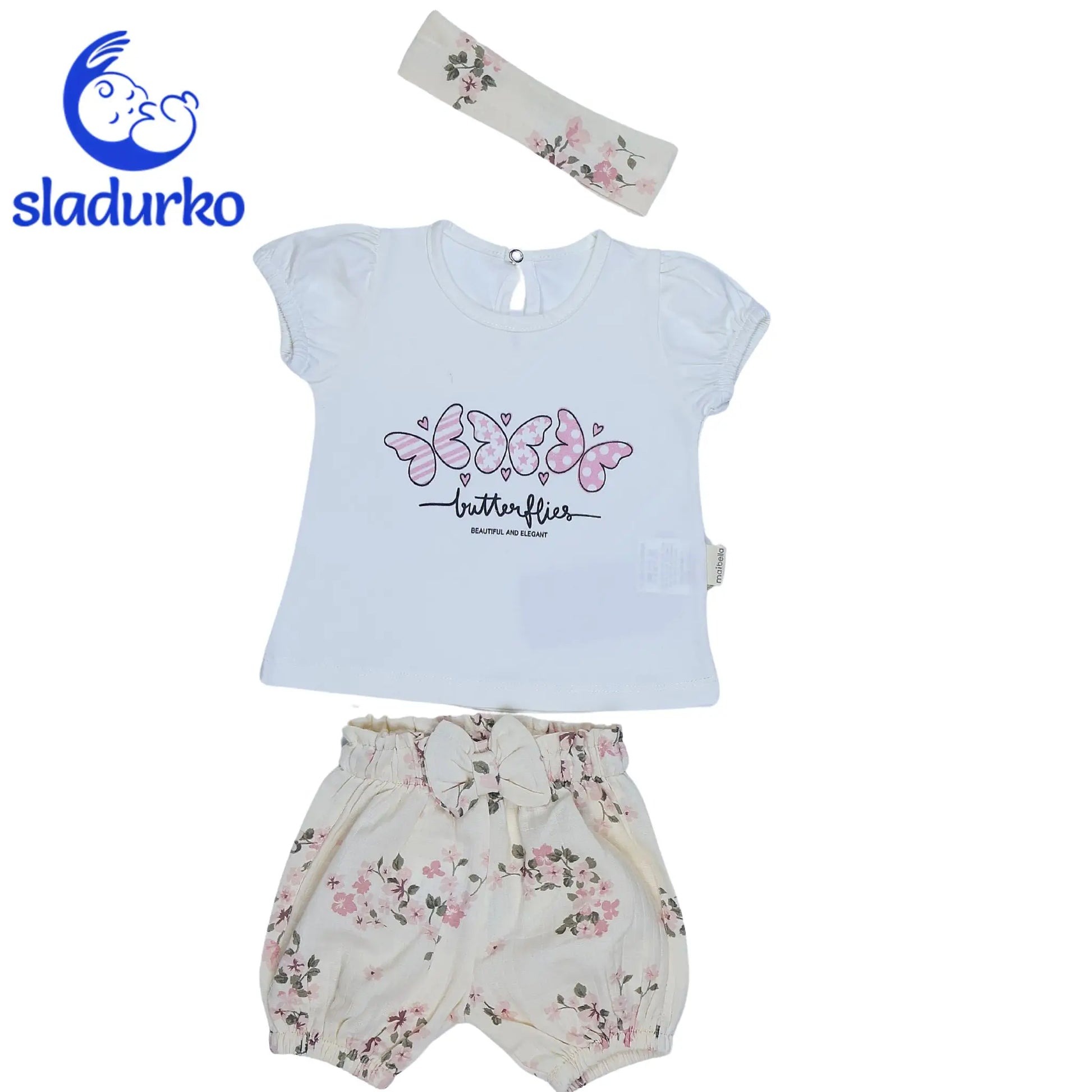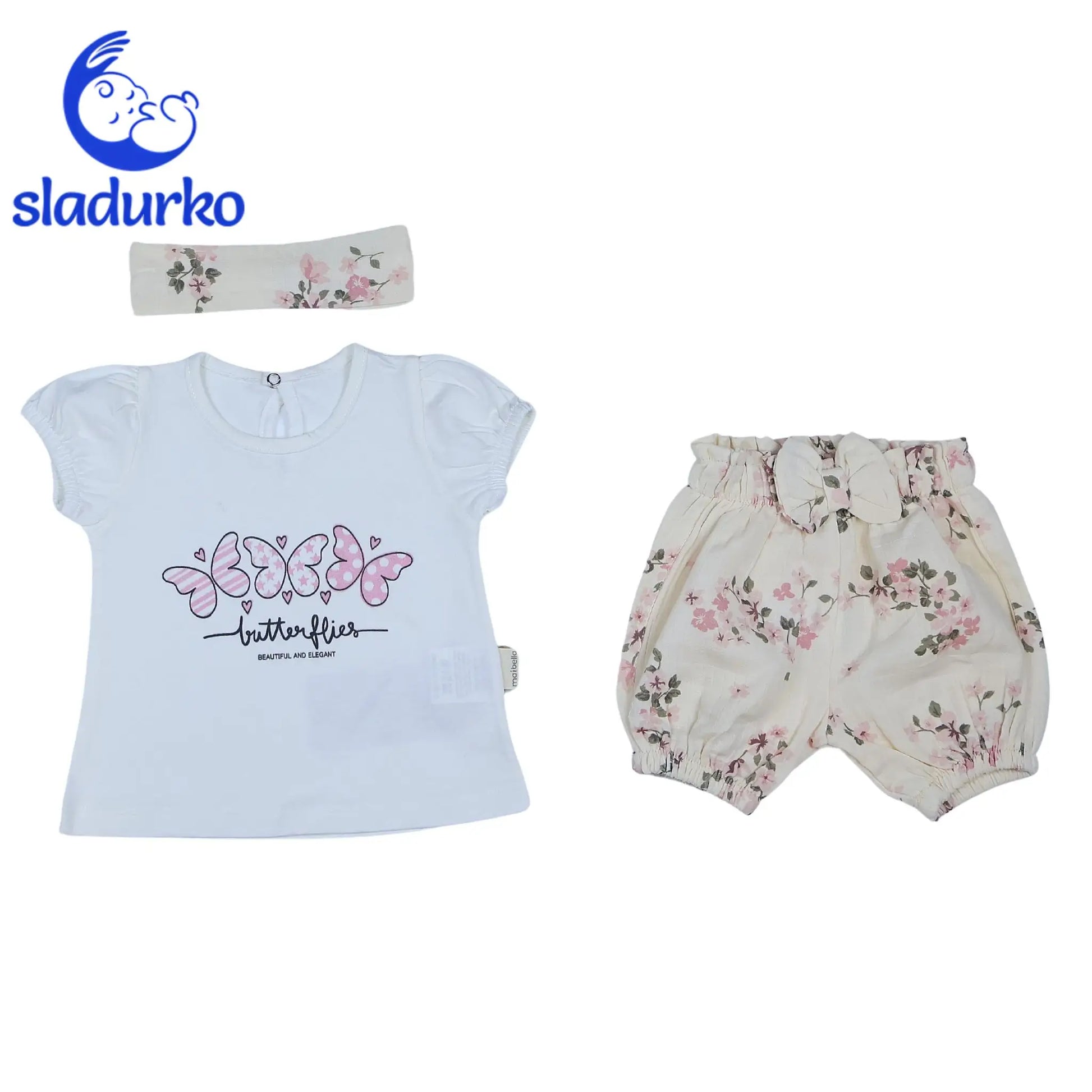 Пригответе вашето малко момиченце за топлите дни с този нежен и стилен комплект от 3 части! Включваща сладка тениска, очарователни панталонки и кокетна диадема, тази комбинация е перфектна за летни разходки и игри.