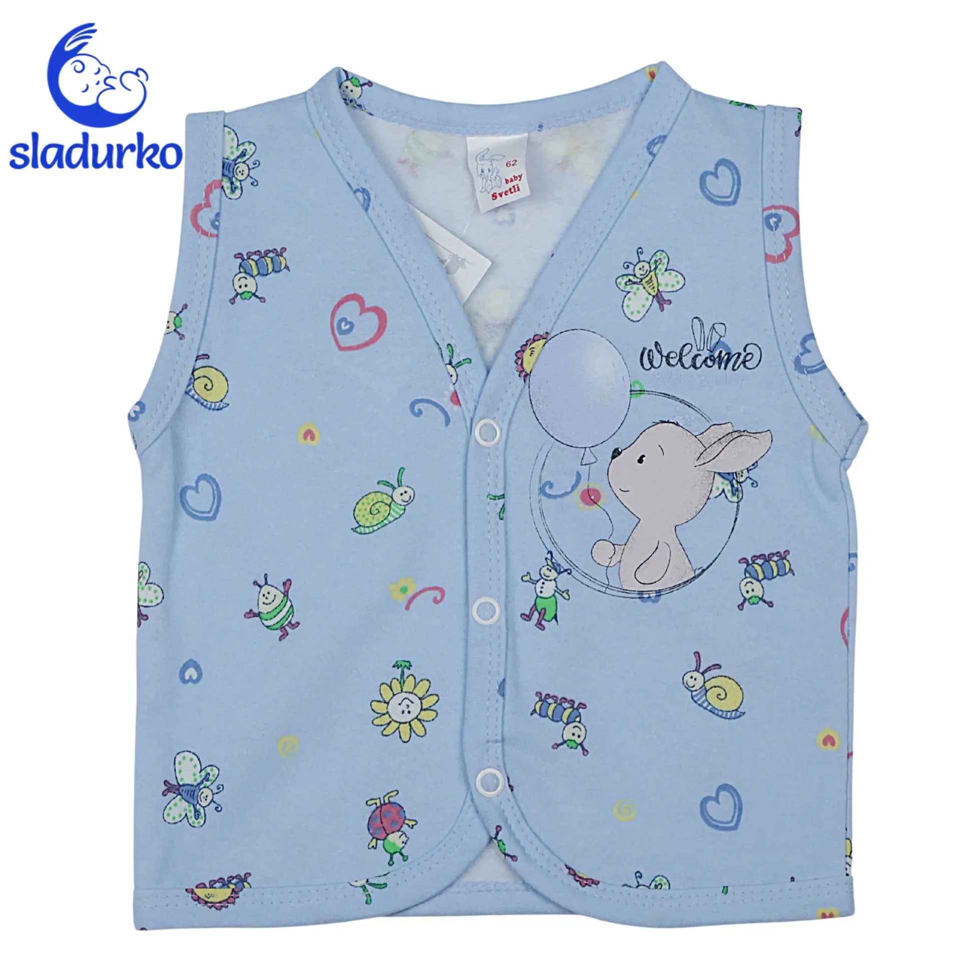 Весел Дизайн: Елекът е в нежен светлосин цвят, украсен с пъстри щампи на сладки буболечки, сърчица и цветя. Централната щампа на зайче с балон и надпис "Welcome" (Добре Дошъл) го прави неустоимо мил.