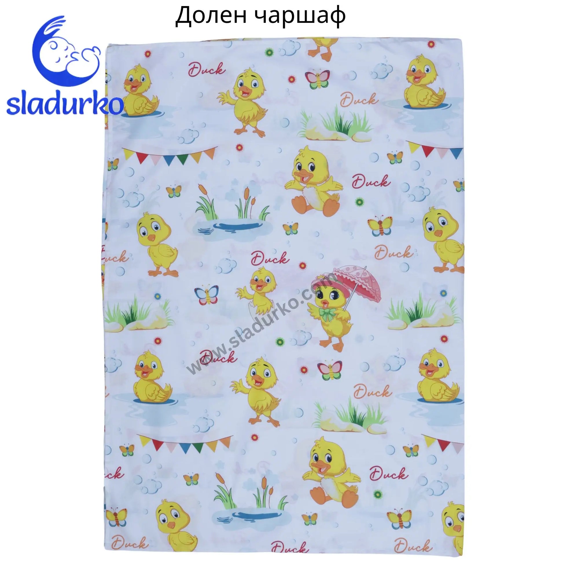 - Долен чаршаф: Свеж бял фон, изпъстрен с игриви щампи, създаващи спокойна и весела атмосфера в детската стая.