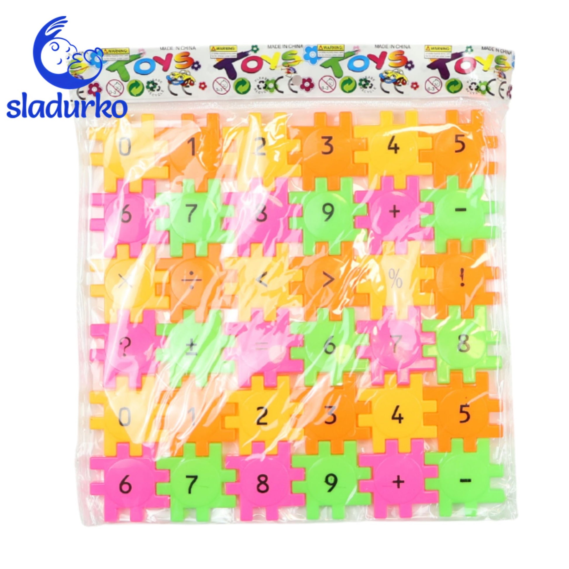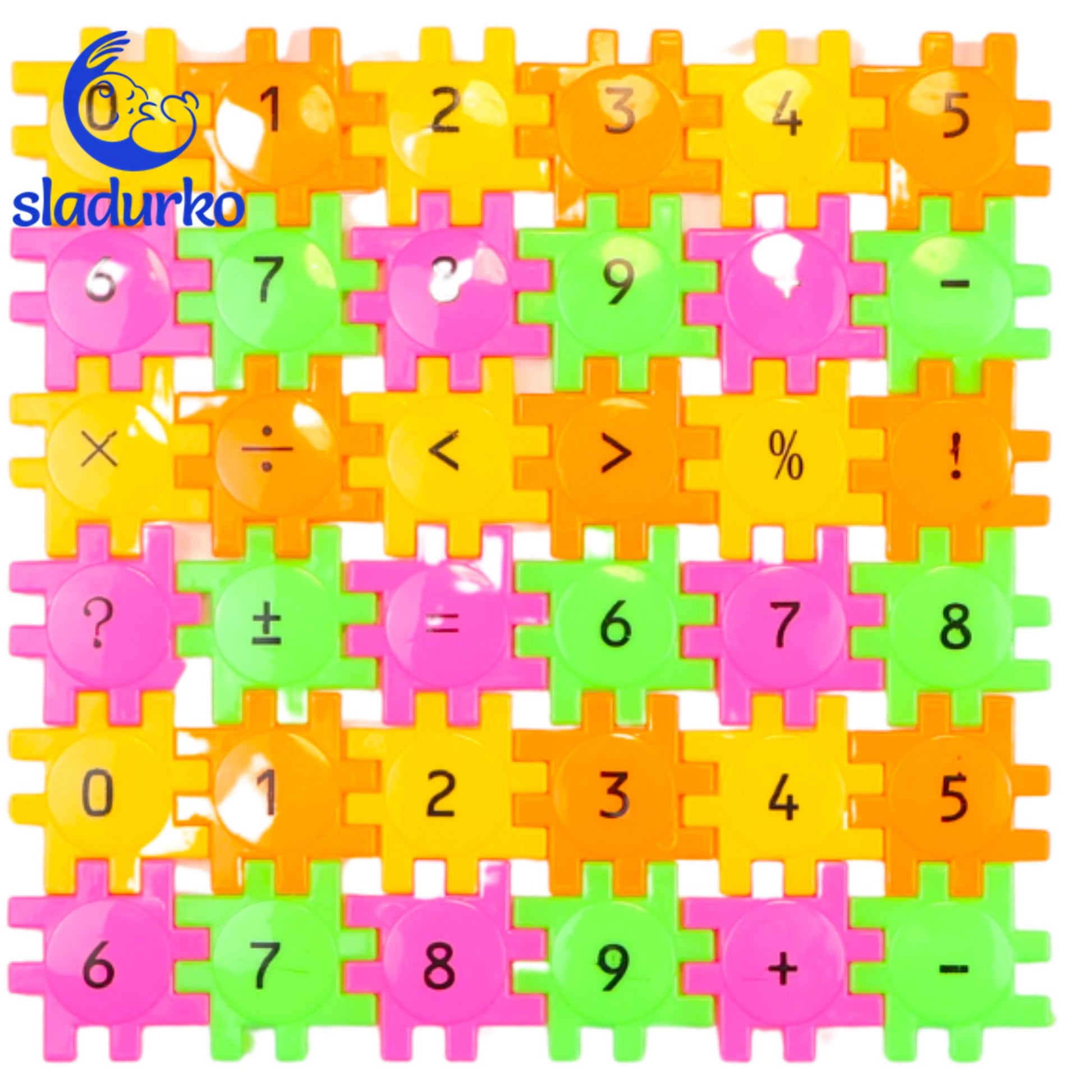 Комплектът съдържа елементи на пъзел с цифрите от 0 до 9, математически знаци и символи.