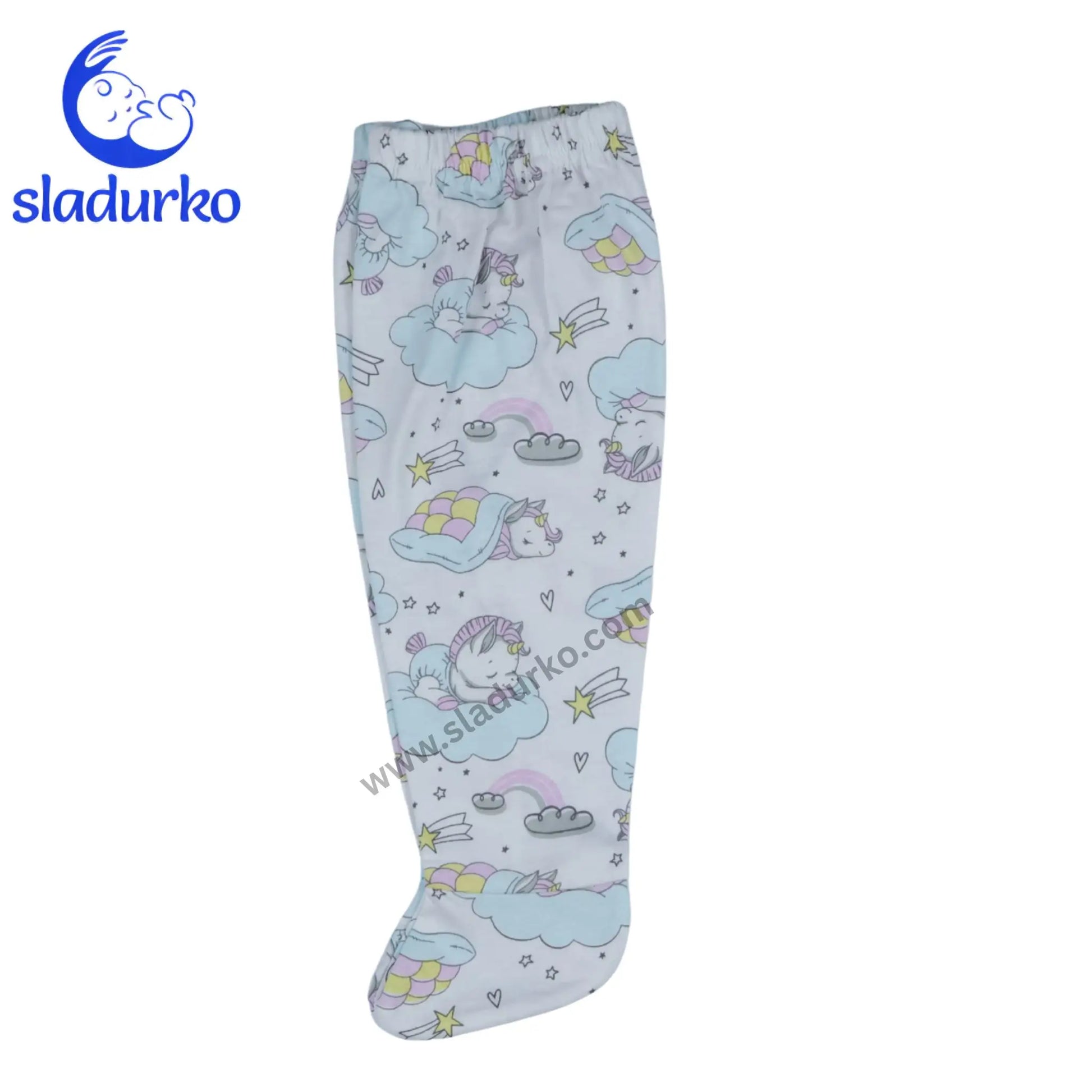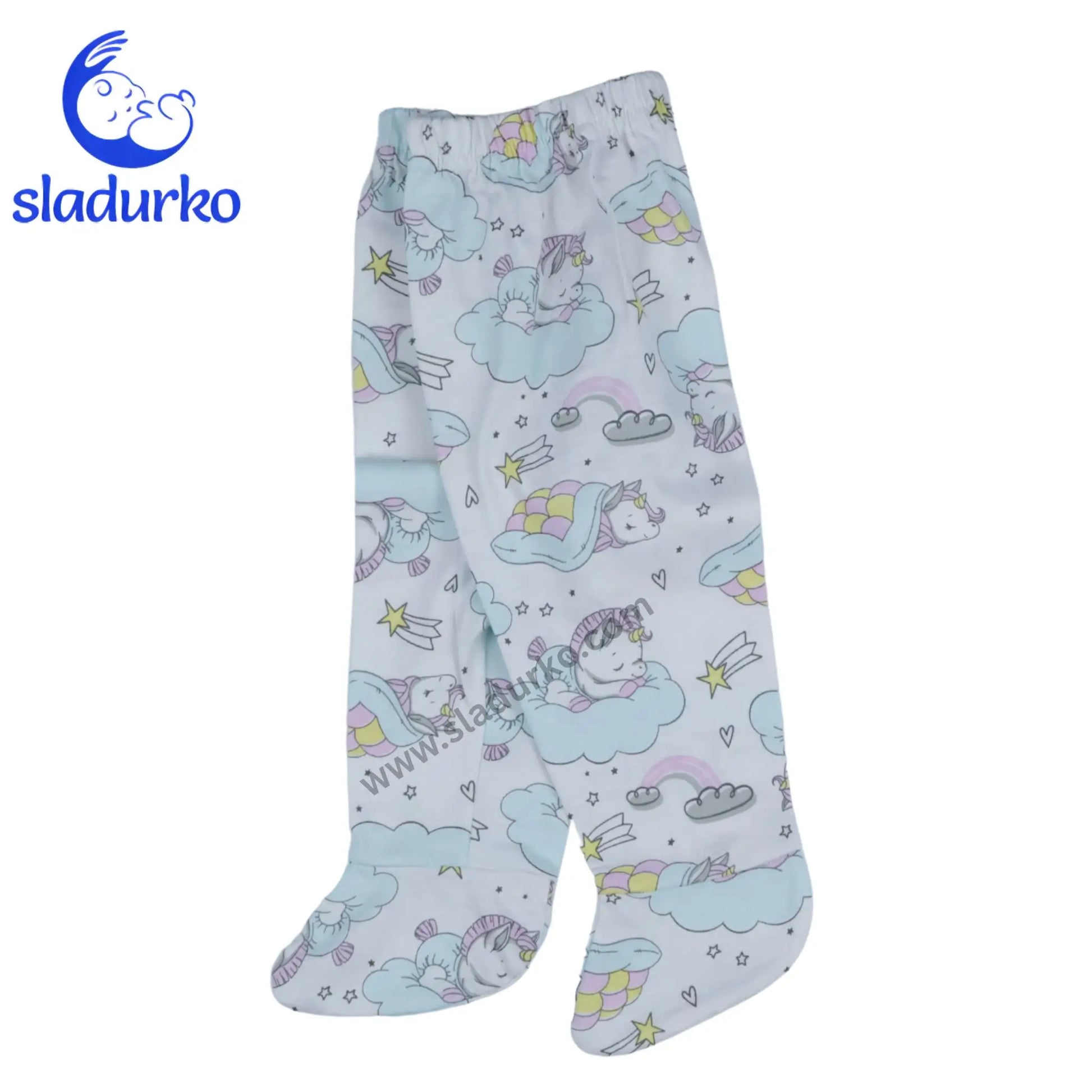 Меки бебешки ританки с крачета, изработени от 100 % висококачествен памук, за максимален комфорт през целия ден и нощ. Деликатният принт с пухкави облачета и сладки еднорози създава приказно настроение и прави грижата за бебето още по-приятна.