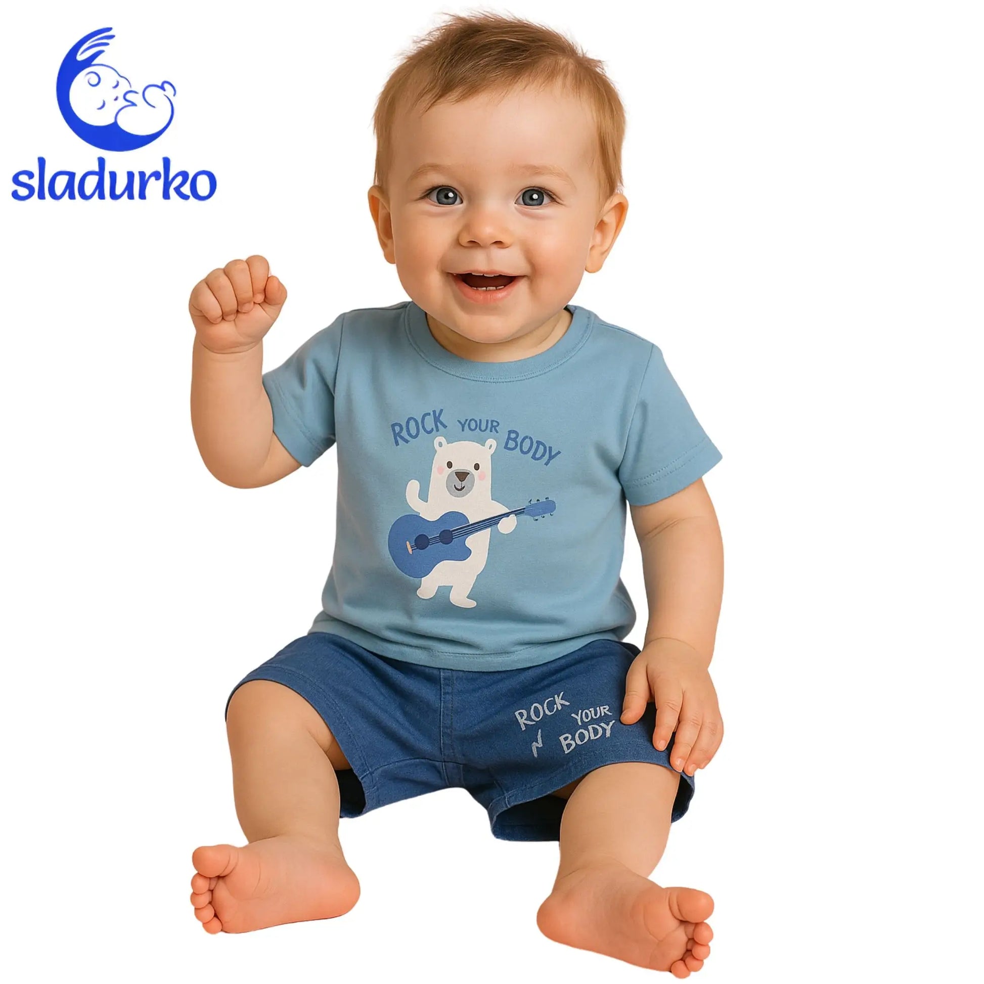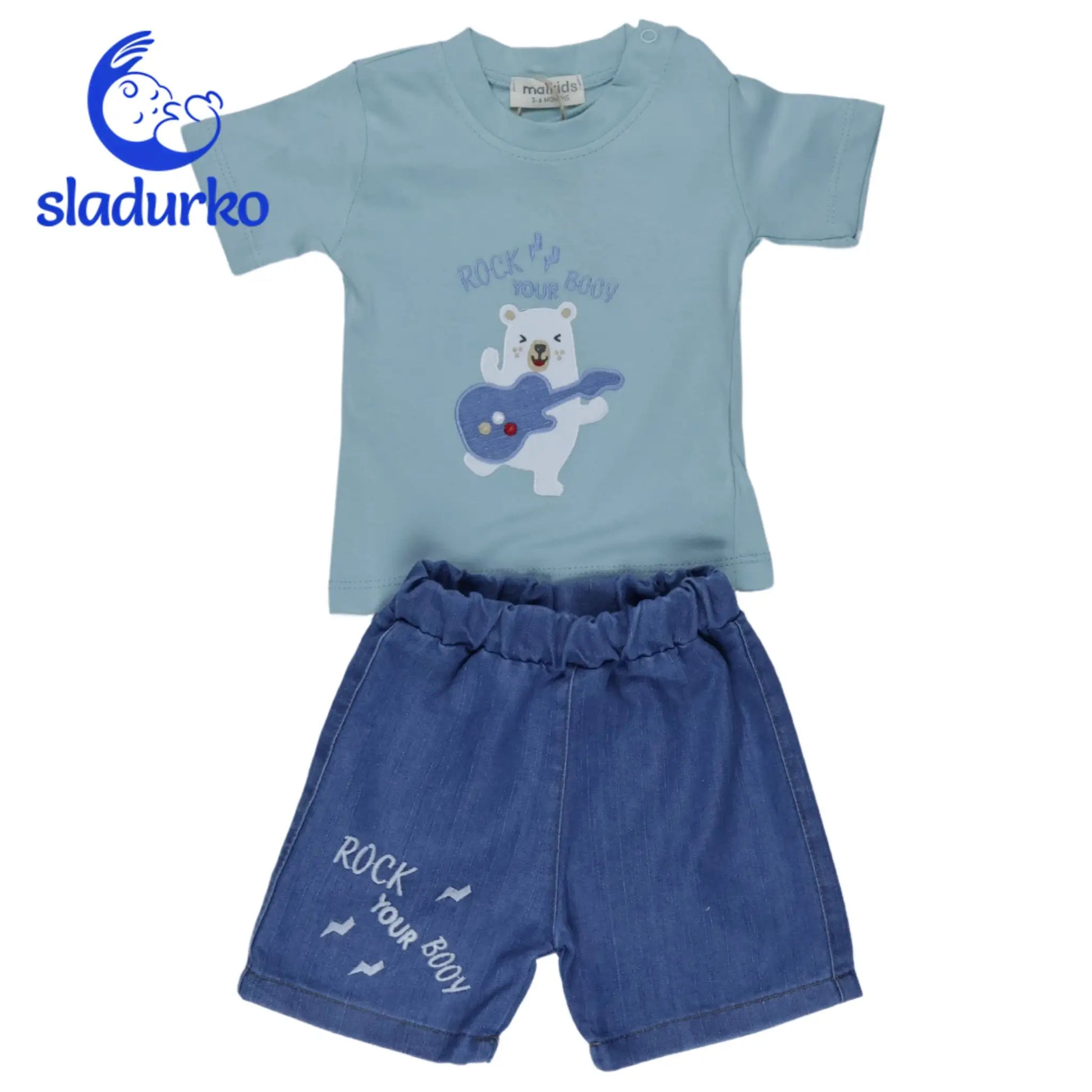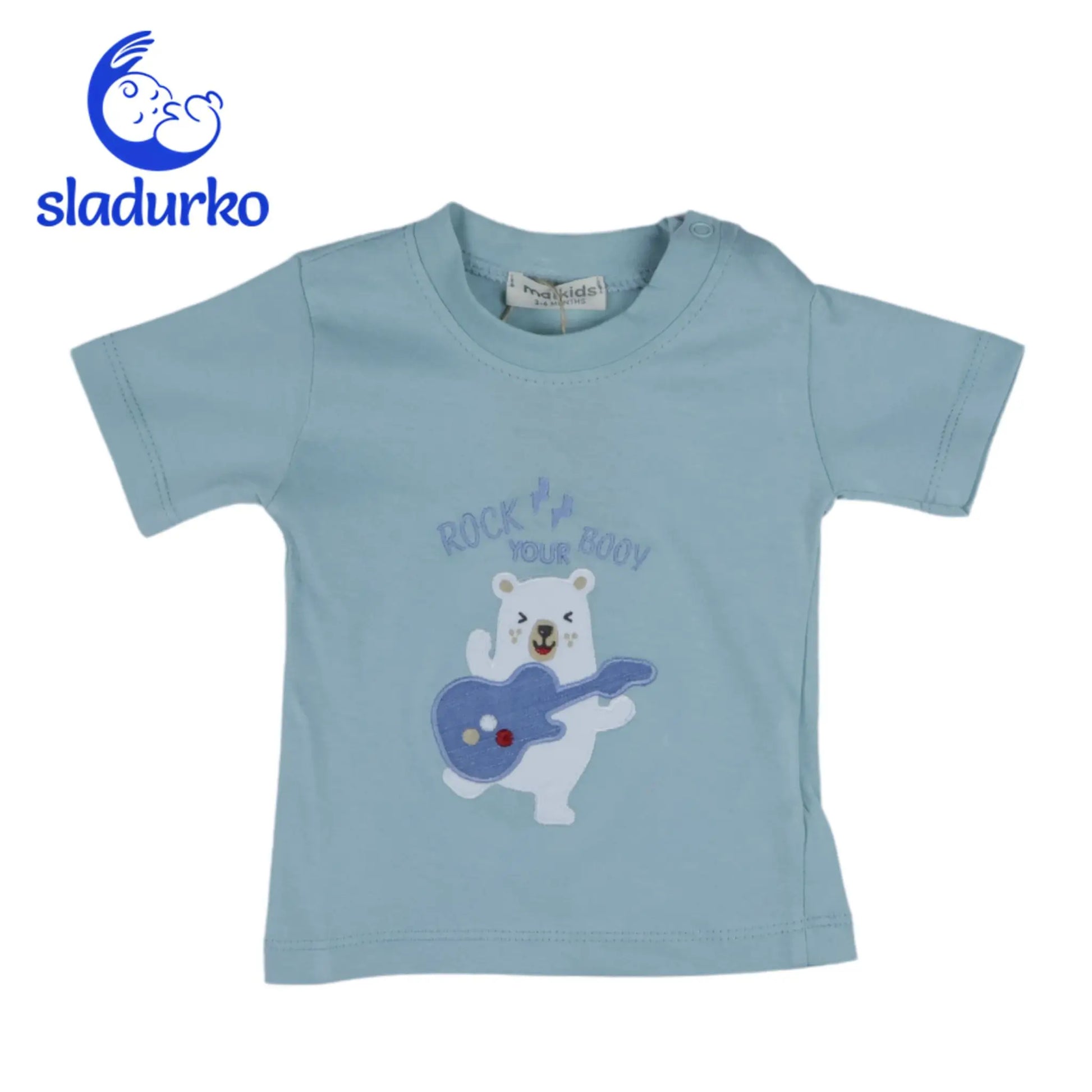 - Тениска: Светлосиня тениска с къс ръкав и апликация на сладко мече, свирещо на китара. Закопчаване с копчета на рамото за лесно обличане.