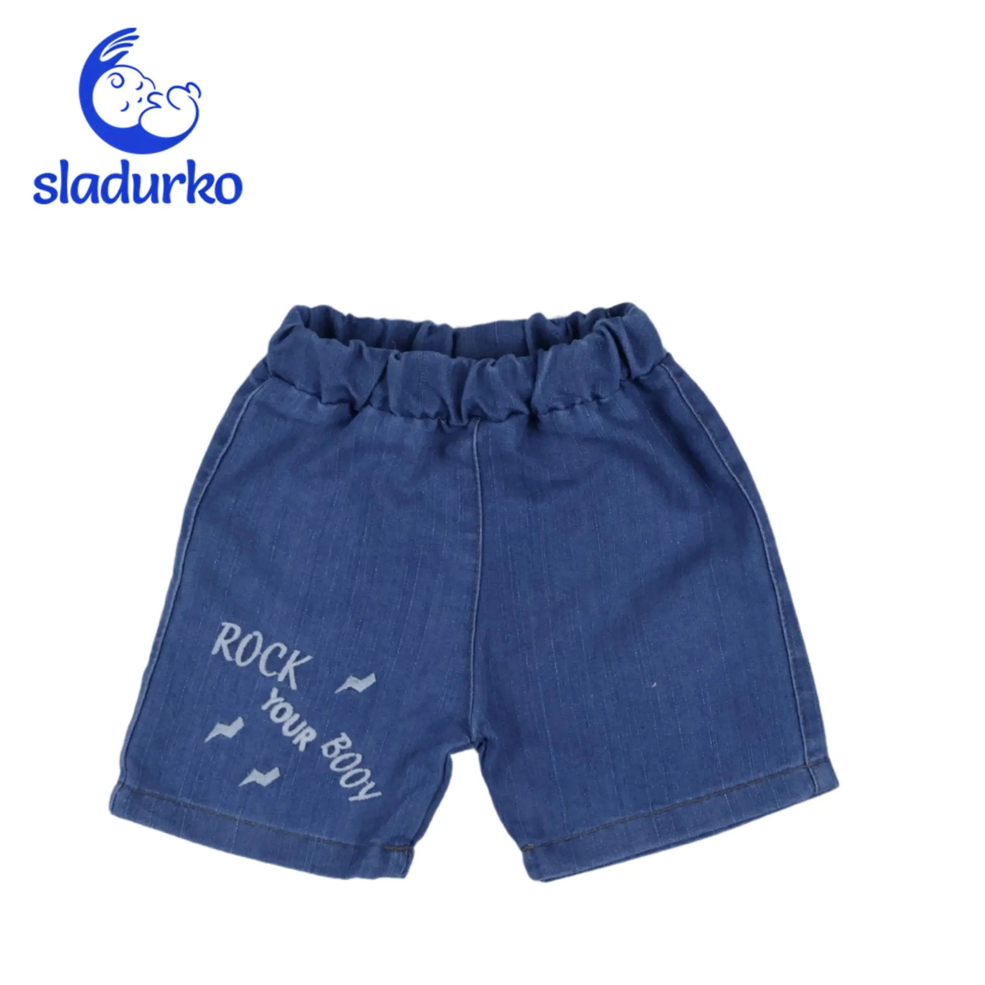 - Къси панталонки: Тъмно сини къси панталонки с еластична талия за удобно прилягане и бял надпис на единия крачол - дънков плат.