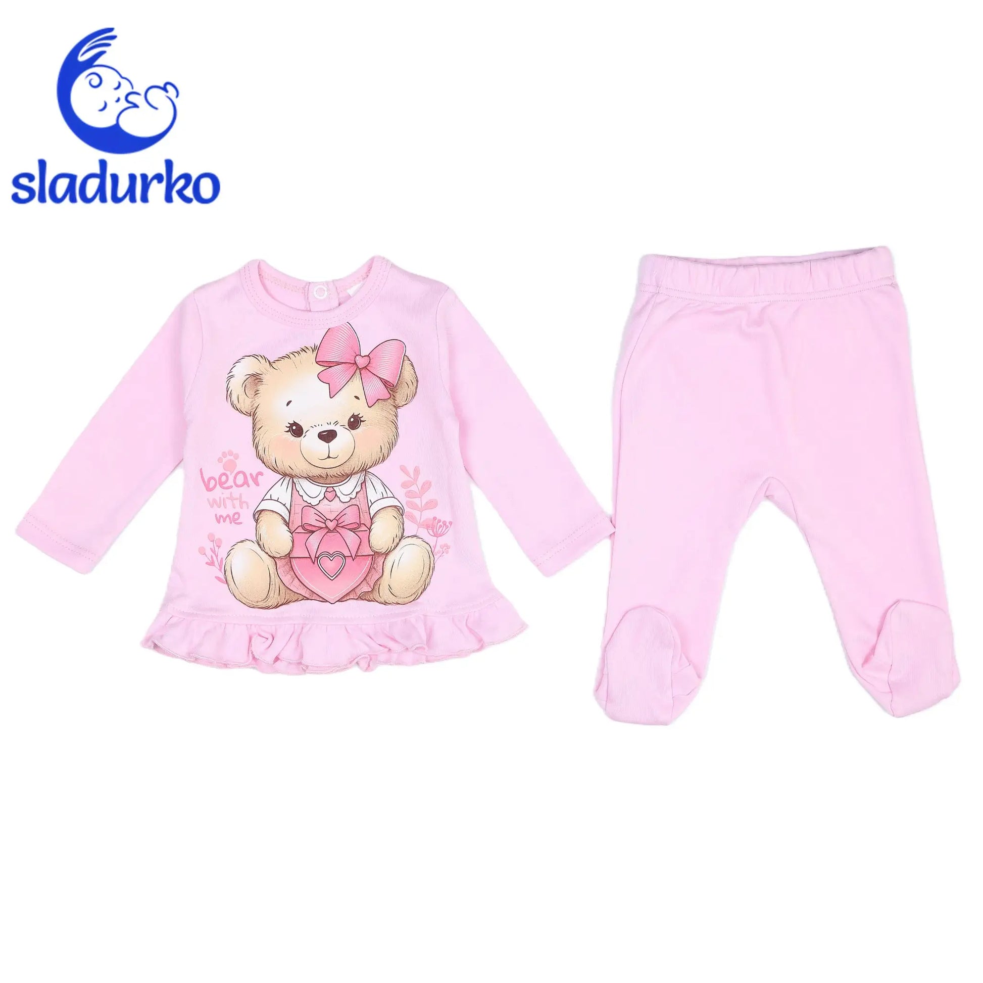 Този нежен и сладък комплект е идеален за вашето малко съкровище. Състои се от удобна блуза с дълъг ръкав и меки ританки, осигурявайки комфорт и очарователна визия през целия ден.