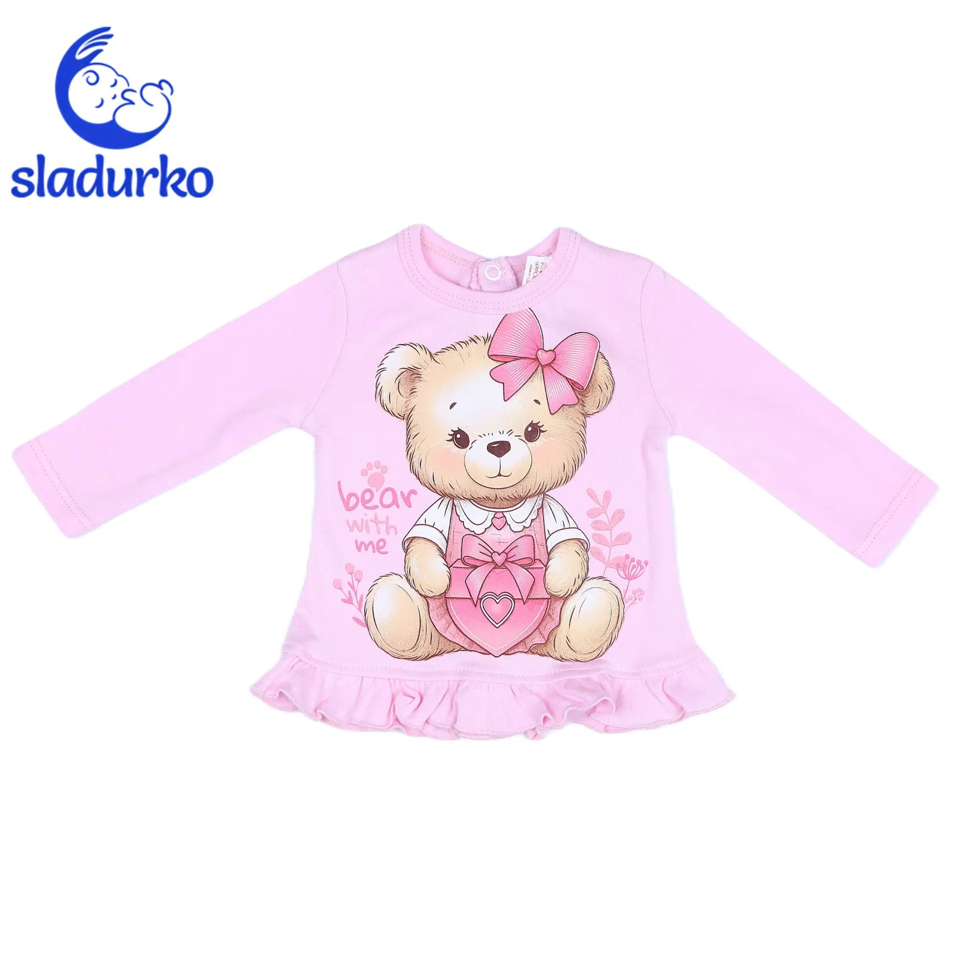 - Блуза:Розова блуза с дълъг ръкав и нежна апликация на сладко мече с розова панделка на главата и сърце в ръцете. Декорирана с малки розови сърчица и надпис "bear with me". Закопчаване с копчета на гърба за лесно обличане. С къдрички в долната част.