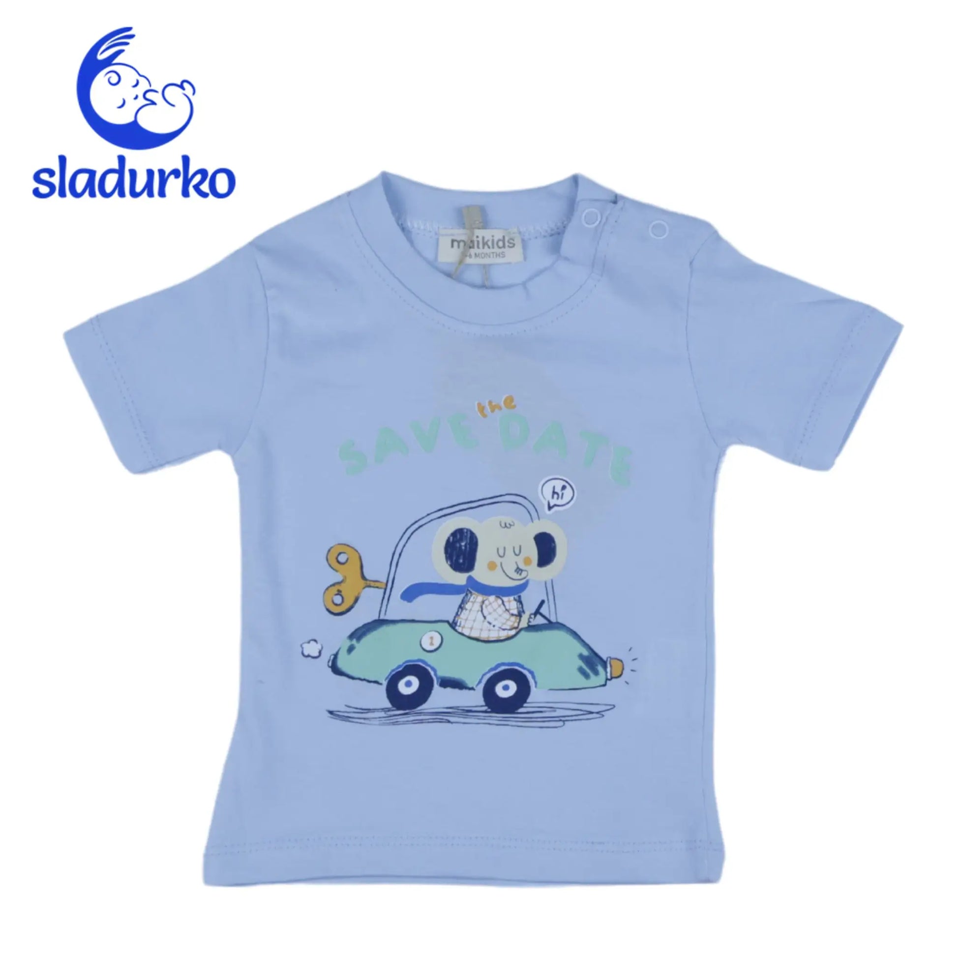 - Тениска: Светлосиня тениска с къс ръкав и цветен принт. Закопчаване с копчета на рамото за лесно обличане.