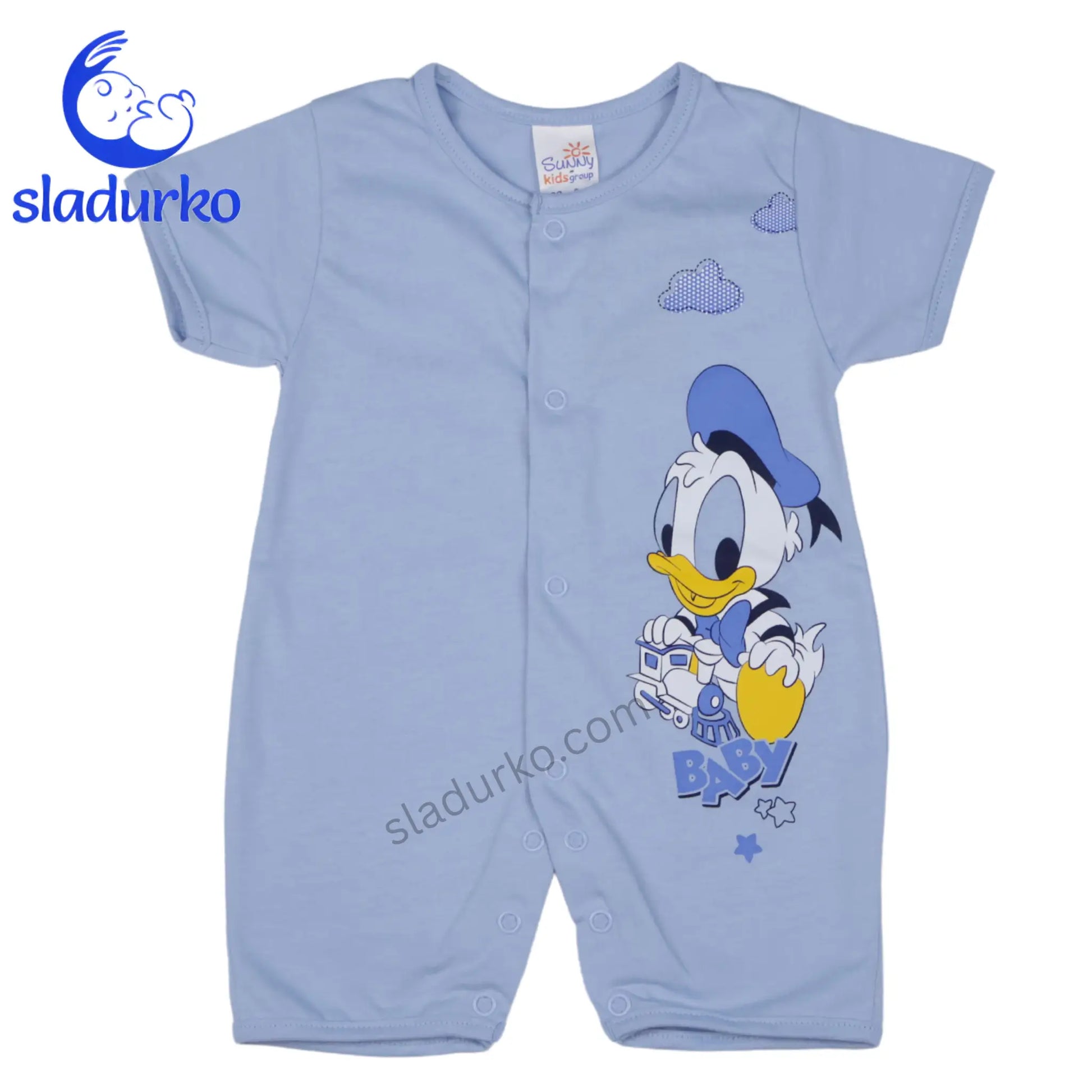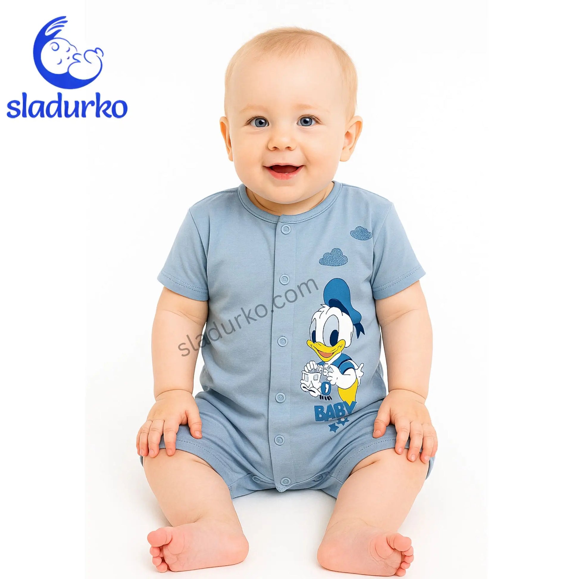 Прекрасен бебешки гащеризон в син цвят, изработен от мека и дишаща материя, идеален за нежната бебешка кожа.