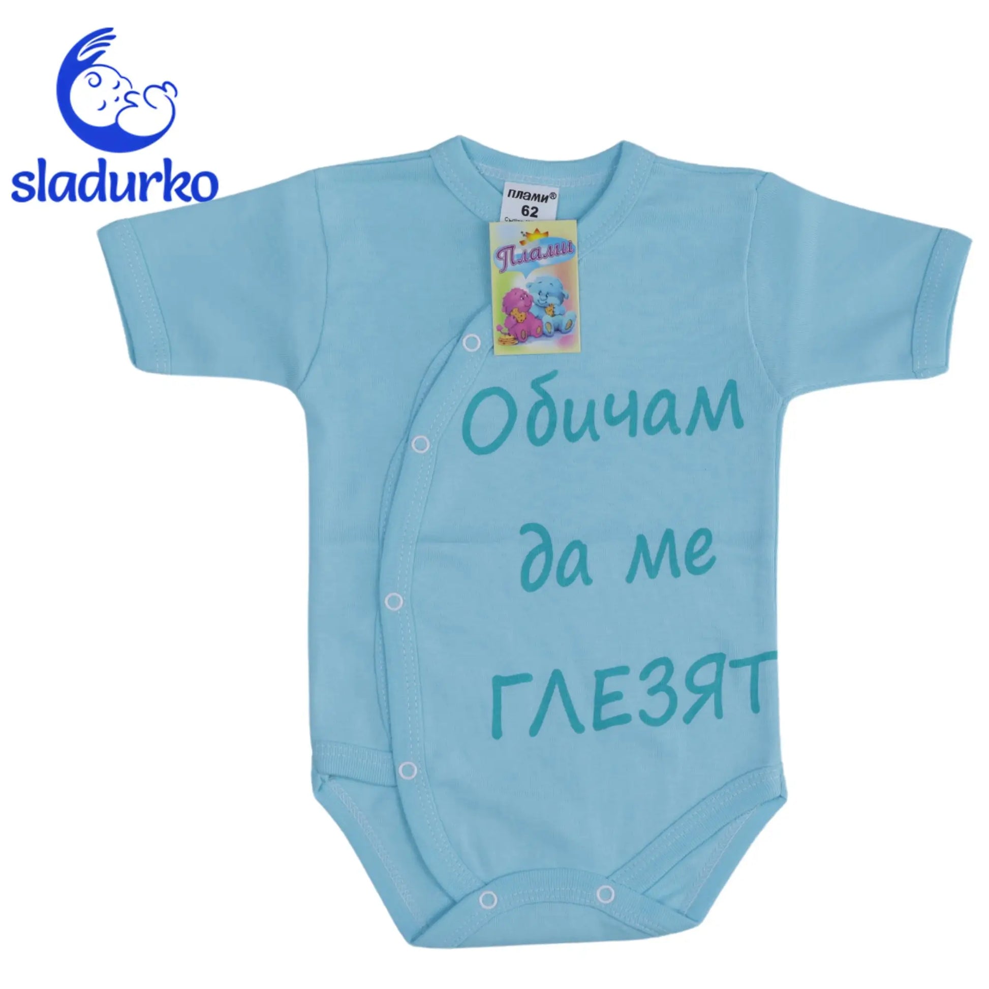 Бебешко боди с къс ръкав, синьозелен цвят и надпис "Обичам да ме глезят"