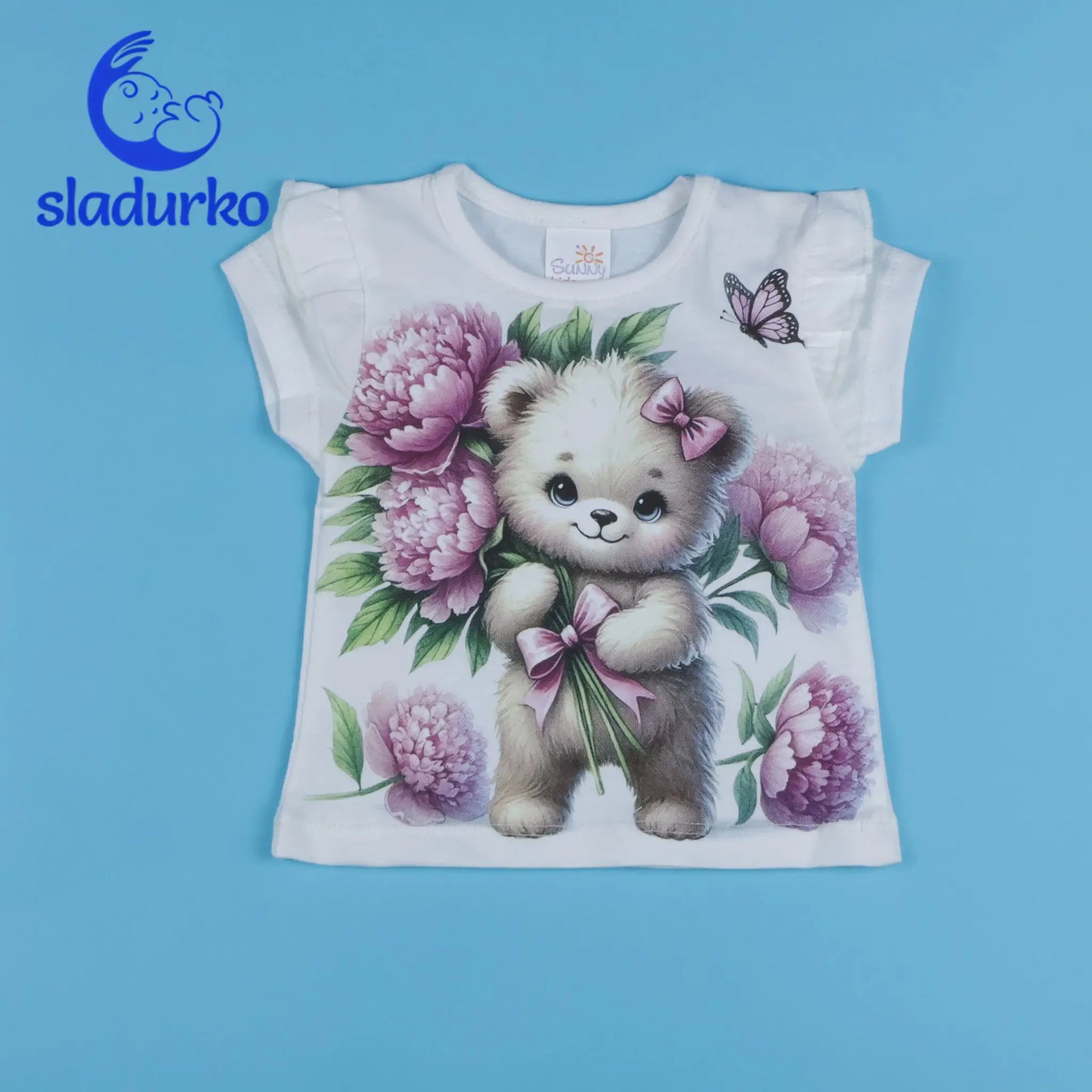 - Тениска: Бяла тениска с къс, набран ръкав. Декорирана с голям цветен принт на сладко мече с розова панделка на главата, държащо букет от розови божури. Допълнителен принт на пеперуда.