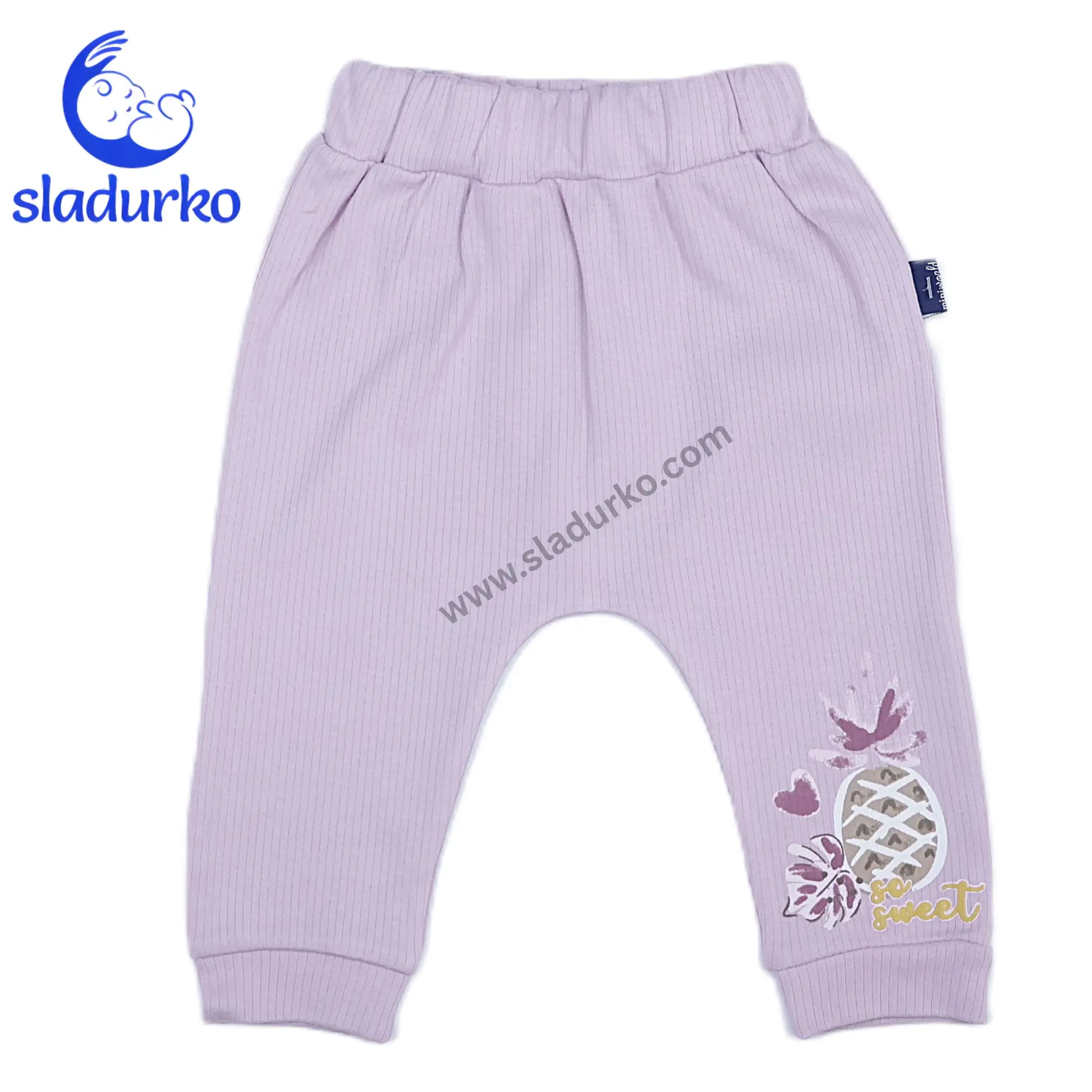 Меки и стилни детски панталонки с висока еластична талия, изработени от фин памучен плат за оптимална мекота и свобода на движение. Моделът с леко спуснато междукрачие осигурява допълнителен комфорт при игра и прохождане, а нежно лилавият нюанс и сладката апликация с ананас и надпис “So Sweet” придават модерен и игрив завършек на визията.