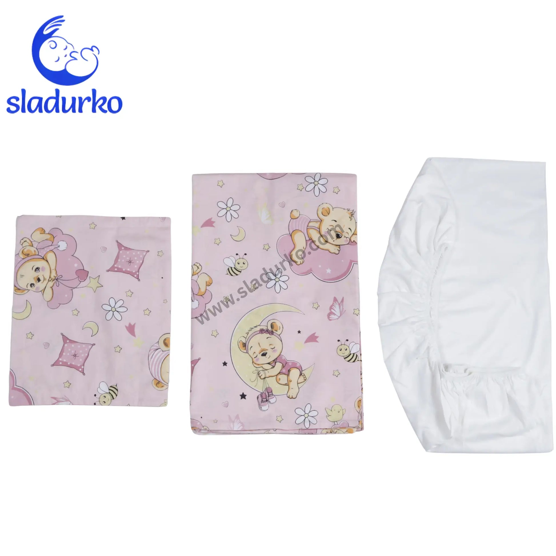 Нежен и практичен спален комплект от 100 % памучен ранфорс, включващ калъфка за възглавница, долен чаршаф с ластик и плик (горен чаршаф с джоб) за матрак 70×140 см.