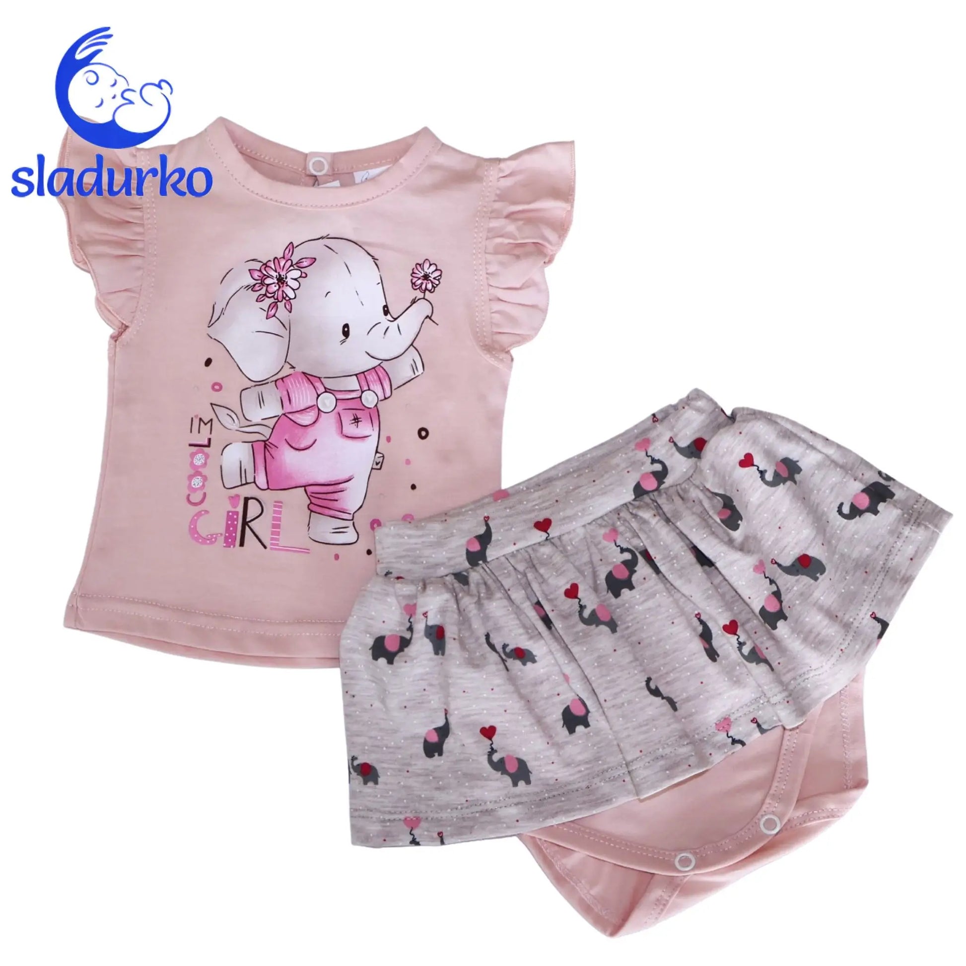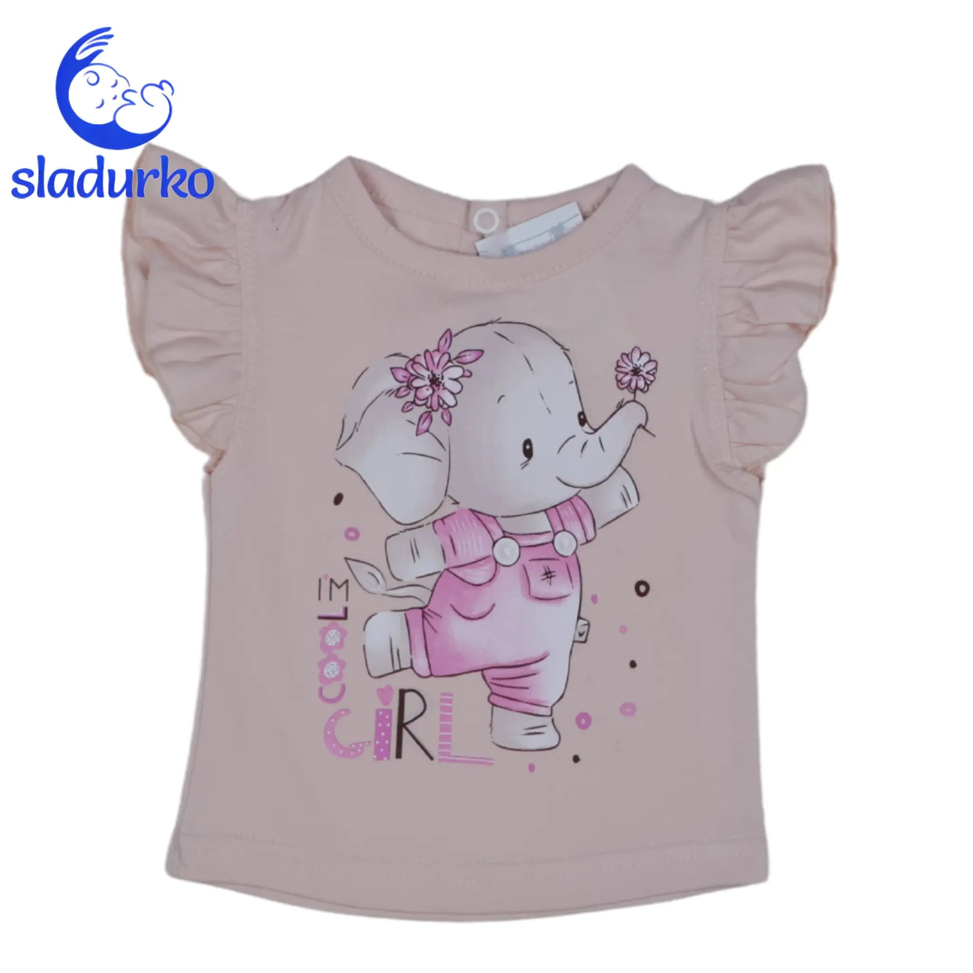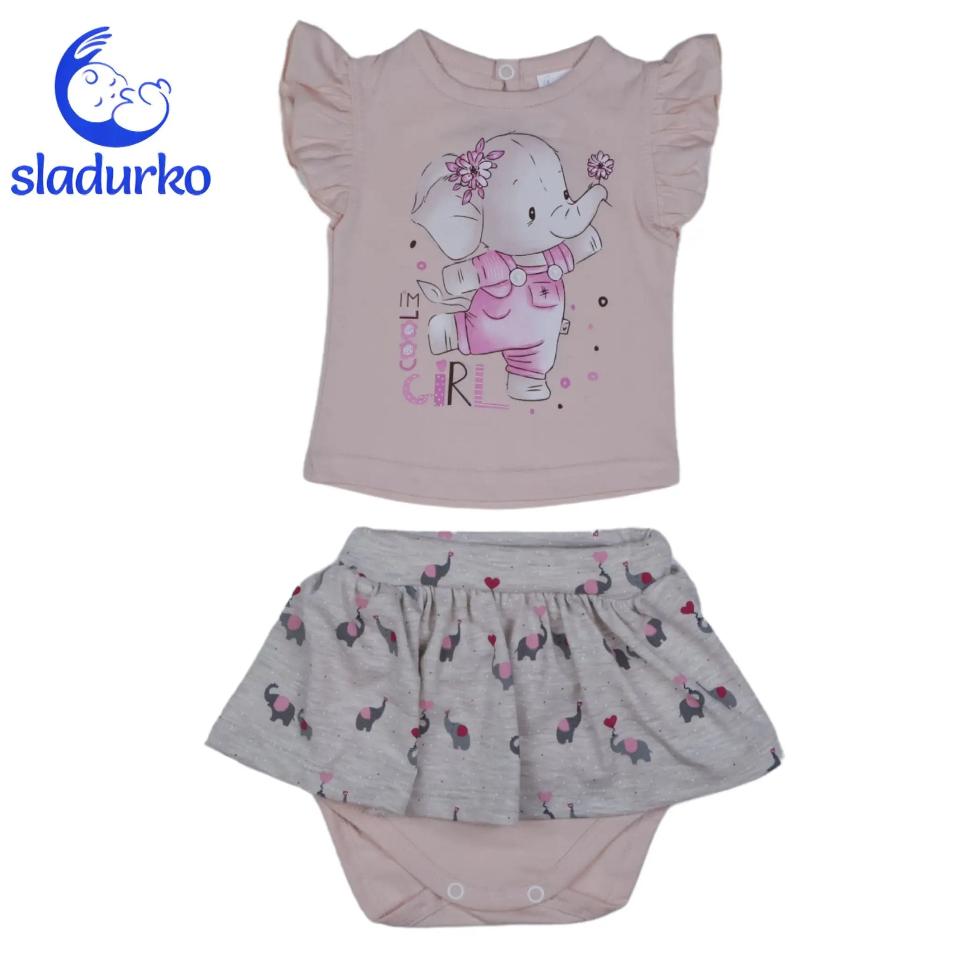 Дизайн: Комплектът включва нежно розова тениска с къс ръкав и къдрички на раменете, както и боди-поличка с принт на слончета.
