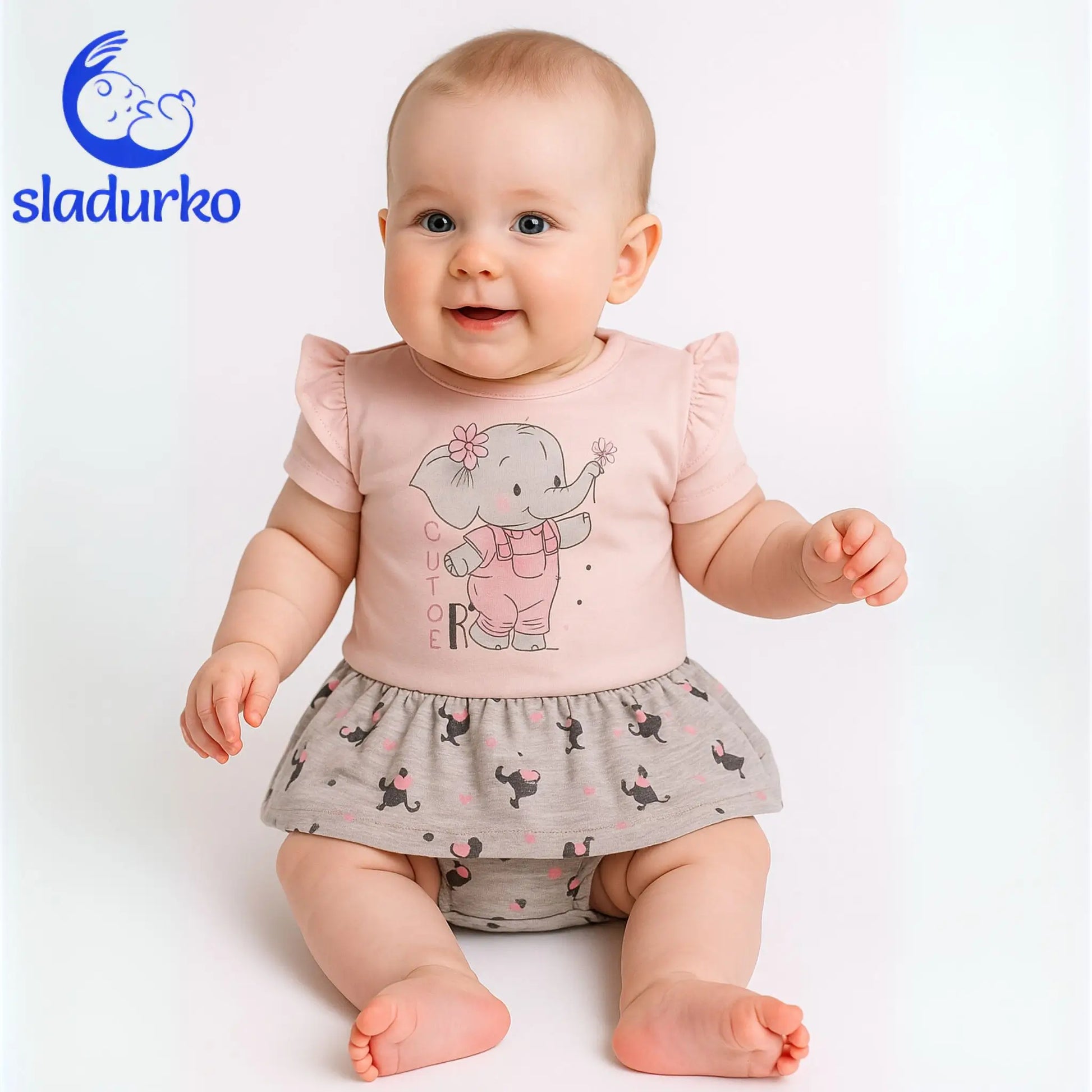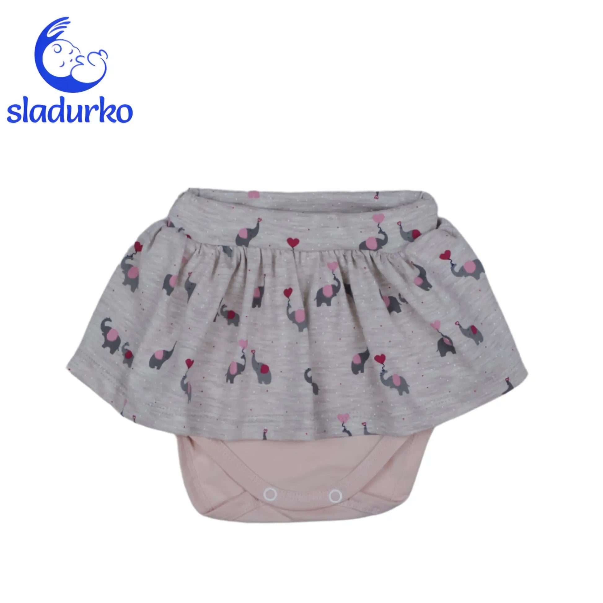 - Боди-поличка: Тя е в розов цвят с пришита пола в светлосив нюанс с щампи на малки слончета.