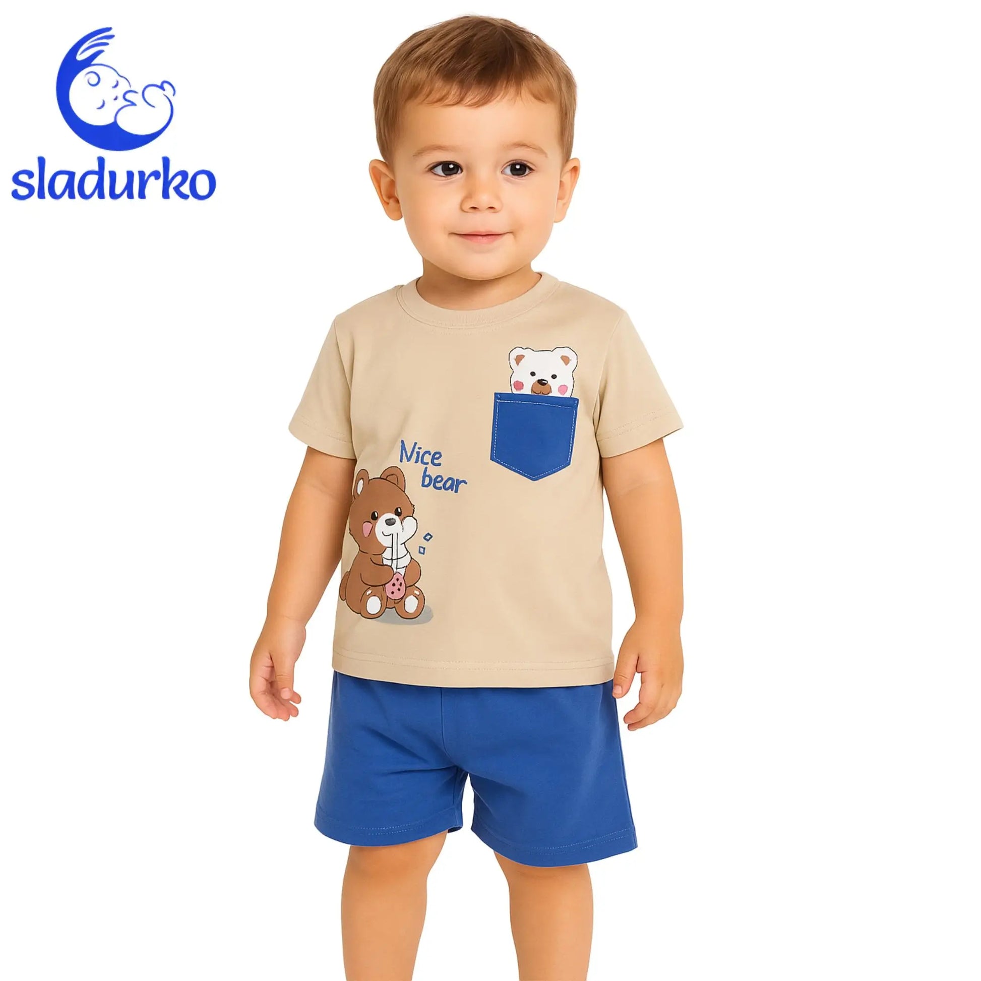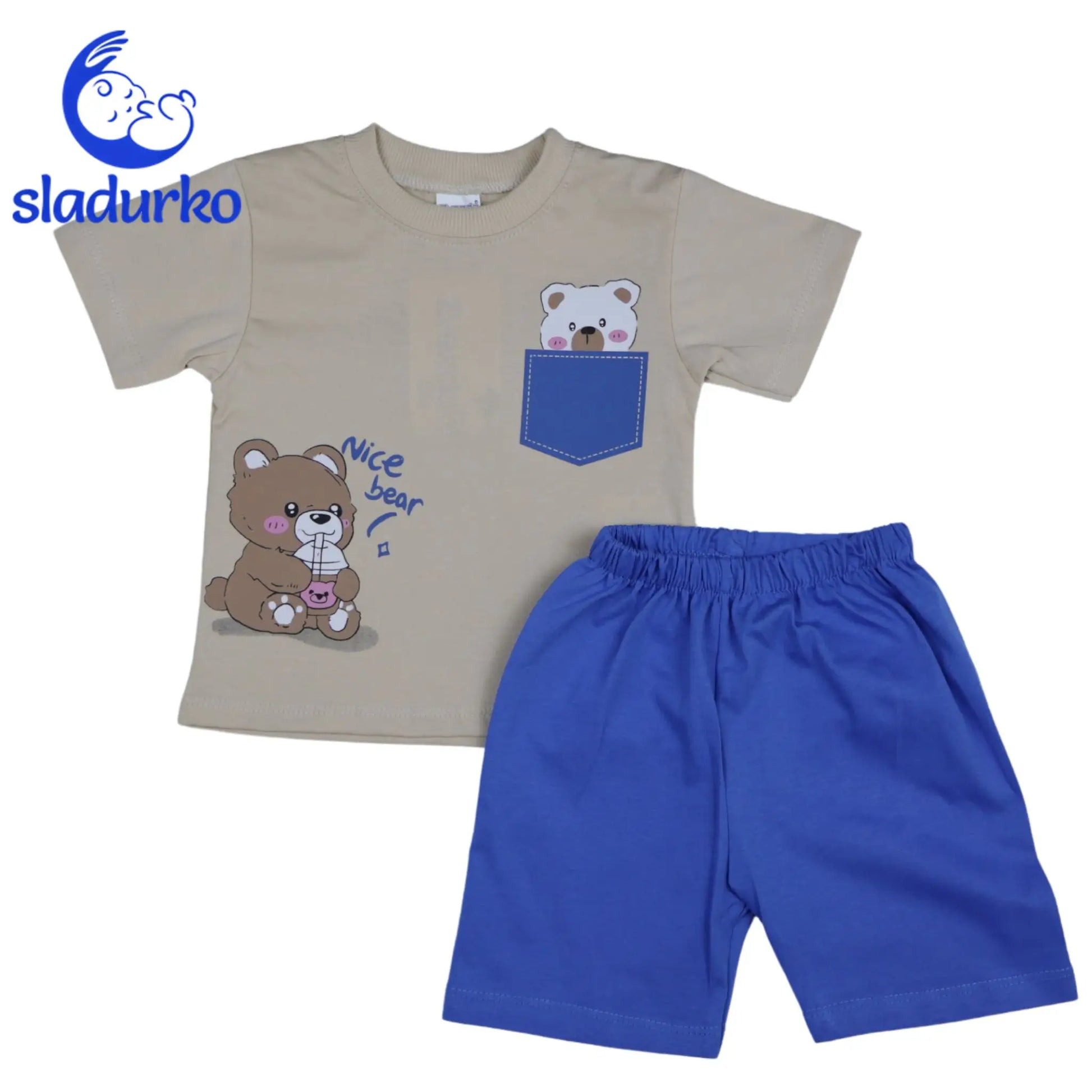 Изработен от мека и висококачествена материя, комплектът е нежен към чувствителната детска кожа. Тениската е в приятен бежов цвят, украсена с две сладки мечета. Късите панталонки са в наситен кралскосин цвят, което придава свеж акцент на комплекта. С удобен ластик на талията, те осигуряват перфектно прилягане и лесно обличане.