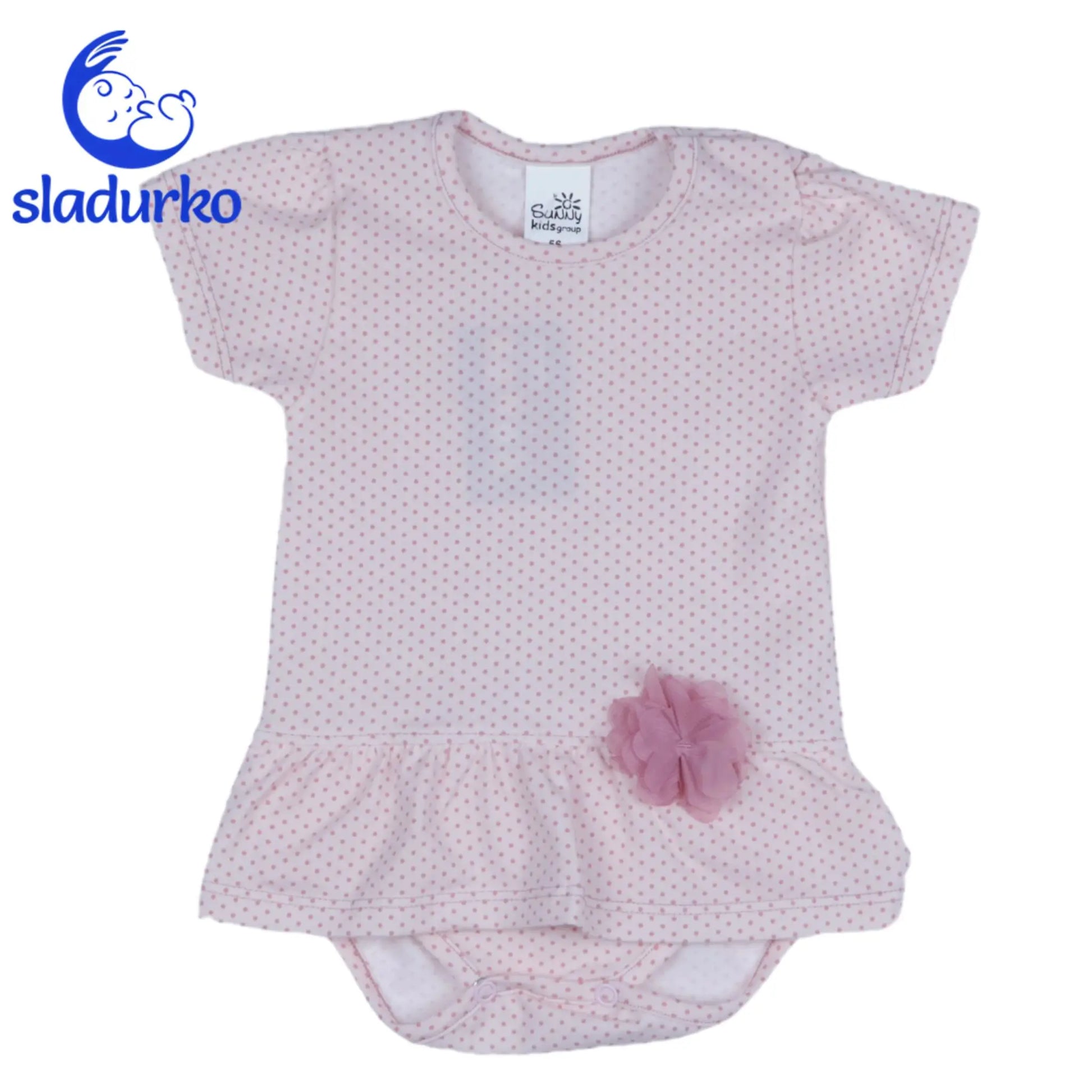 - Изящен дизайн: В нежен розов цвят с деликатни точки по цялата повърхност, тази боди рокля излъчва сладост и чар. Добавеното 3D цвете в същия тон придава елегантен и завършен вид.