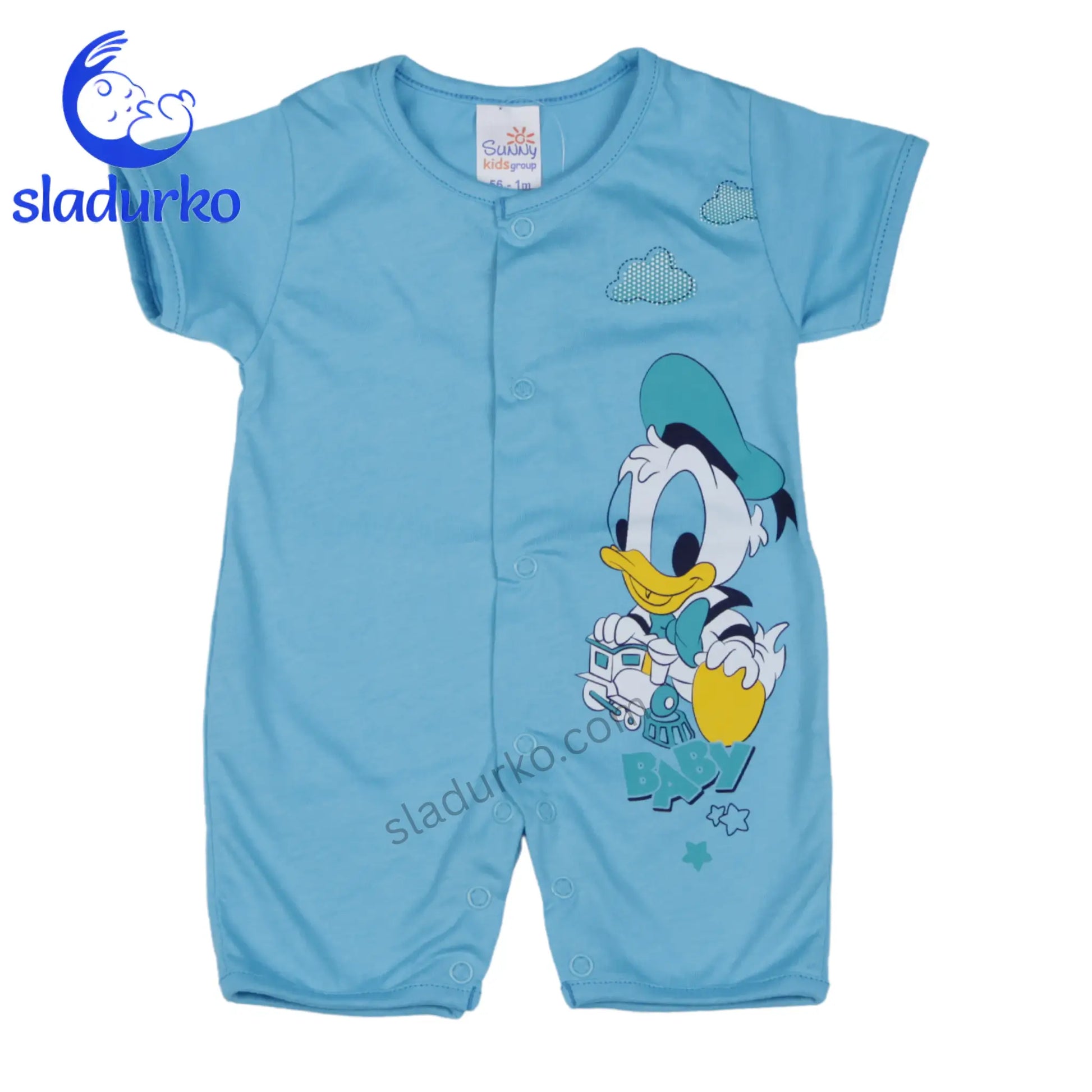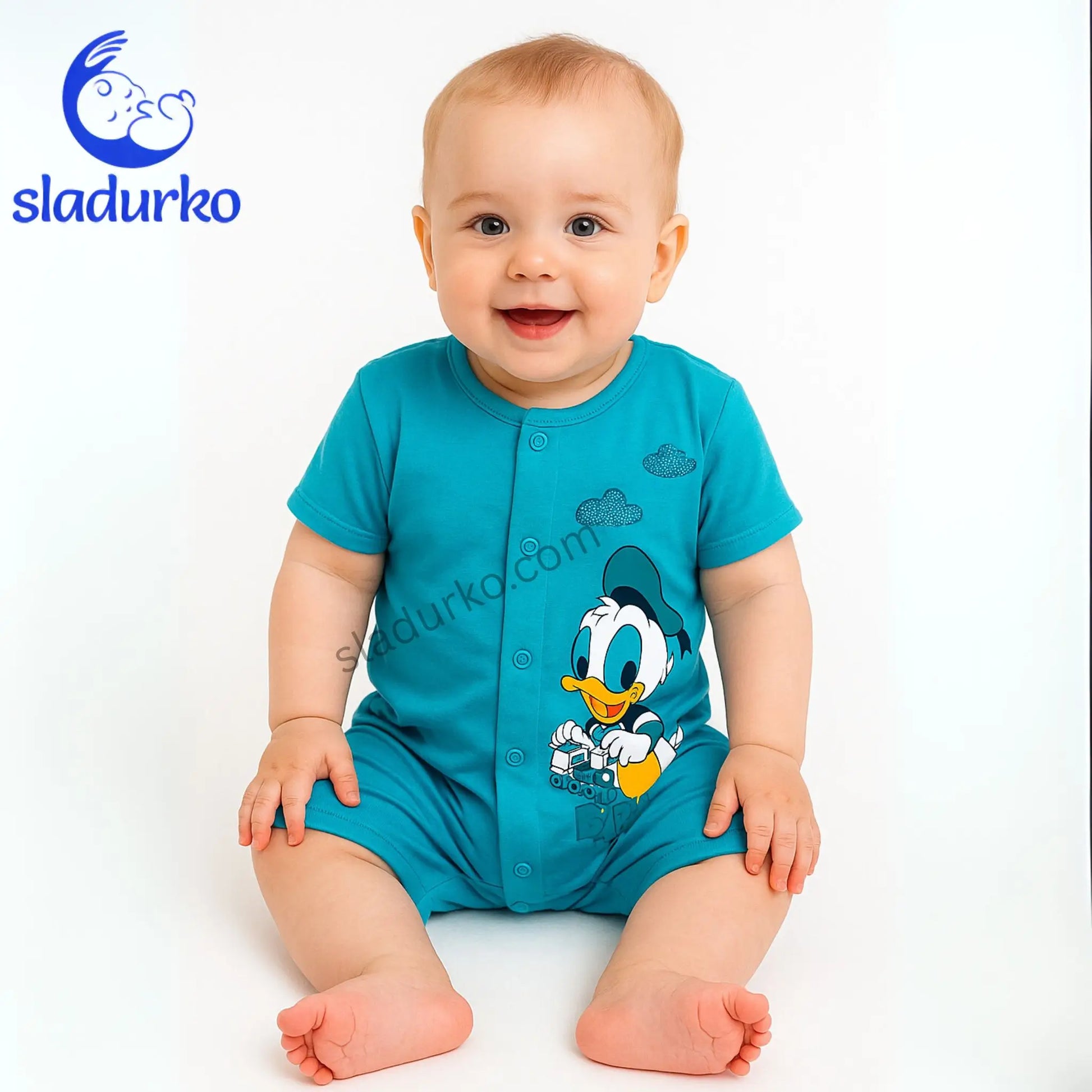 Прекрасен бебешки гащеризон в тюркоазен цвят, изработен от мека и дишаща материя, идеален за нежната бебешка кожа.