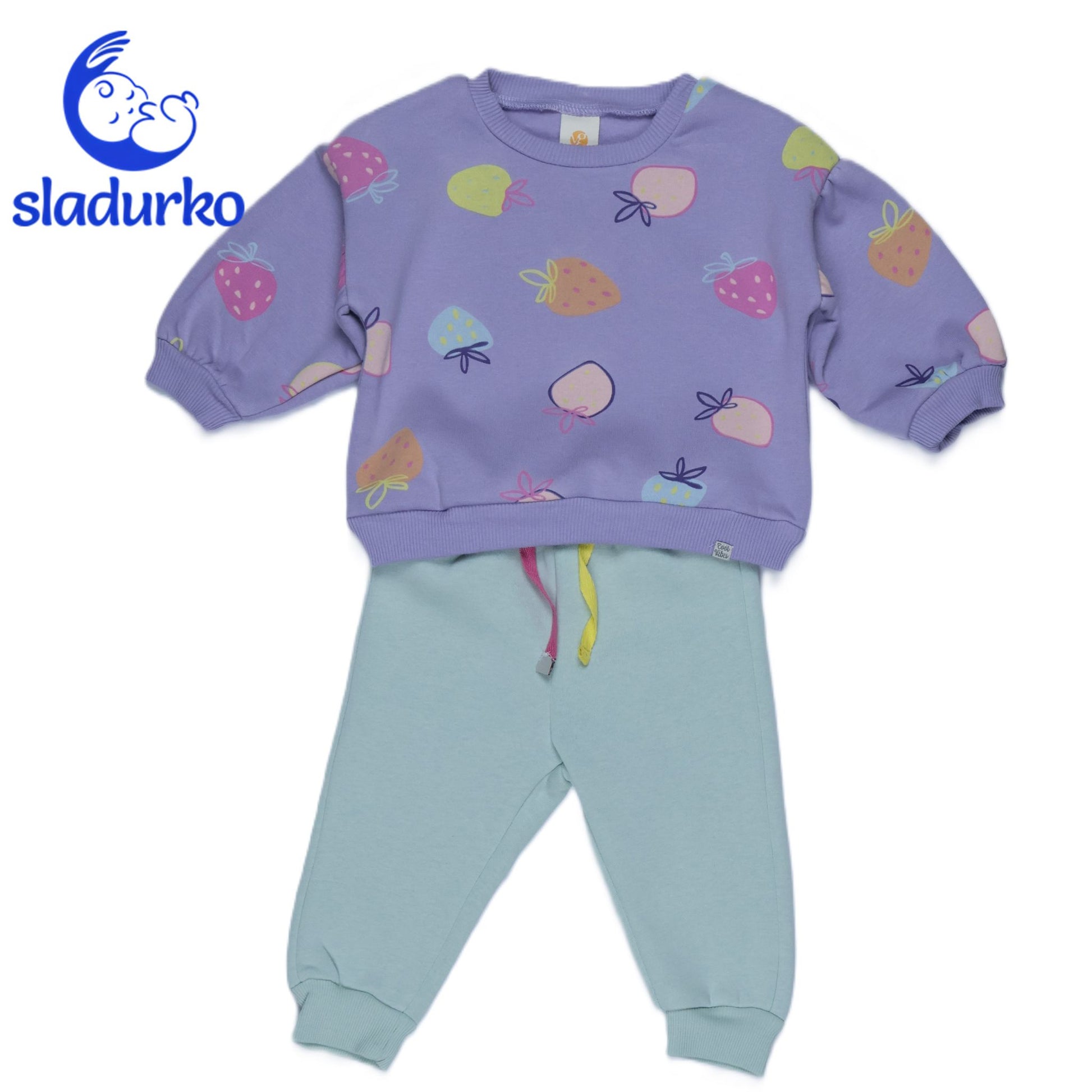 Този уютен ватиран комплект е перфектният избор за ежедневния комфорт на вашето дете. Създаден от мека и топла материя, комплектът включва широка блузка с дълги ръкави в нежно лилаво, украсена с весели щампи на ягодки в пастелни цветове, които създават игрив и свеж дизайн.