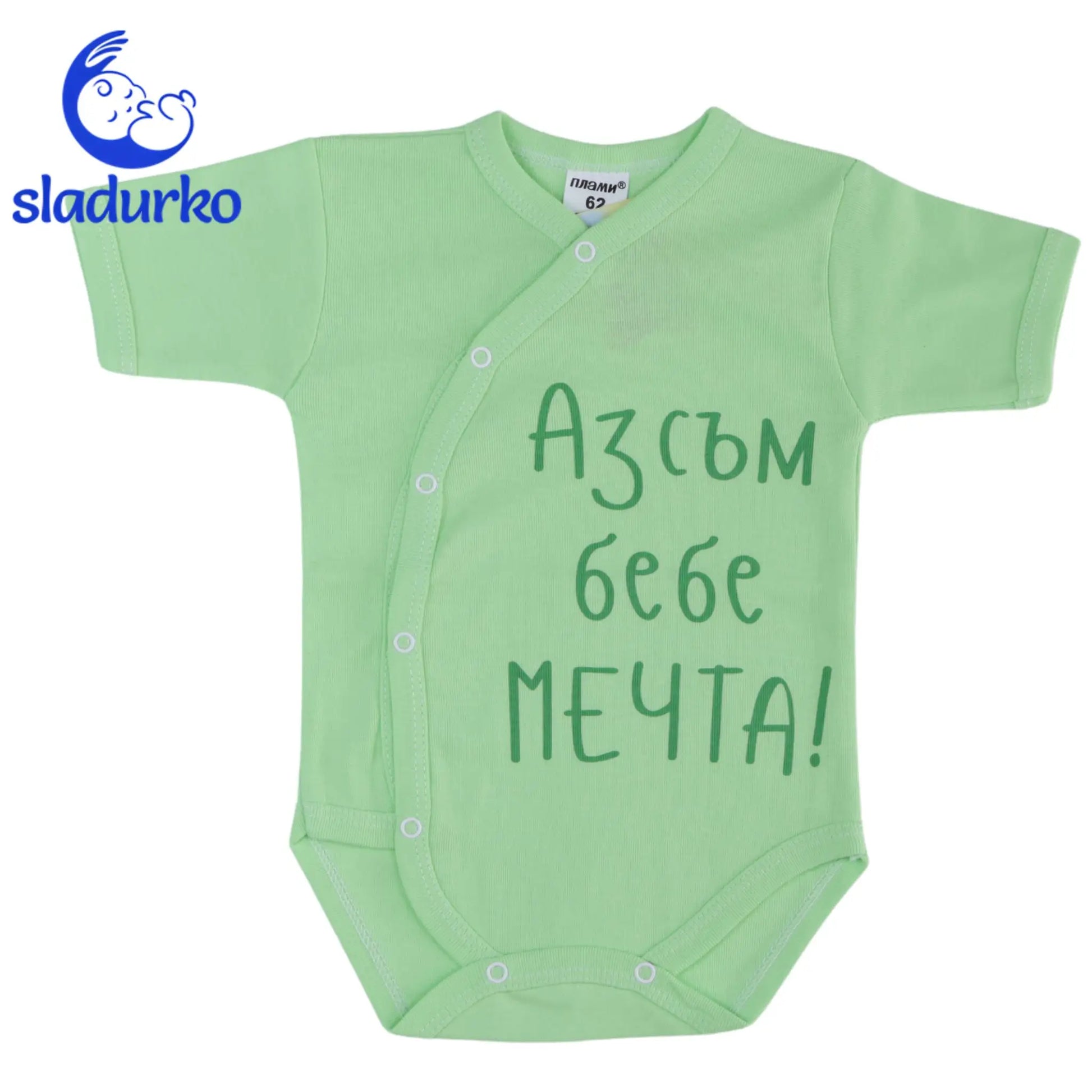 Бебешко боди с къс ръкав, зелен цвят и надпис "Аз съм бебе мечта"