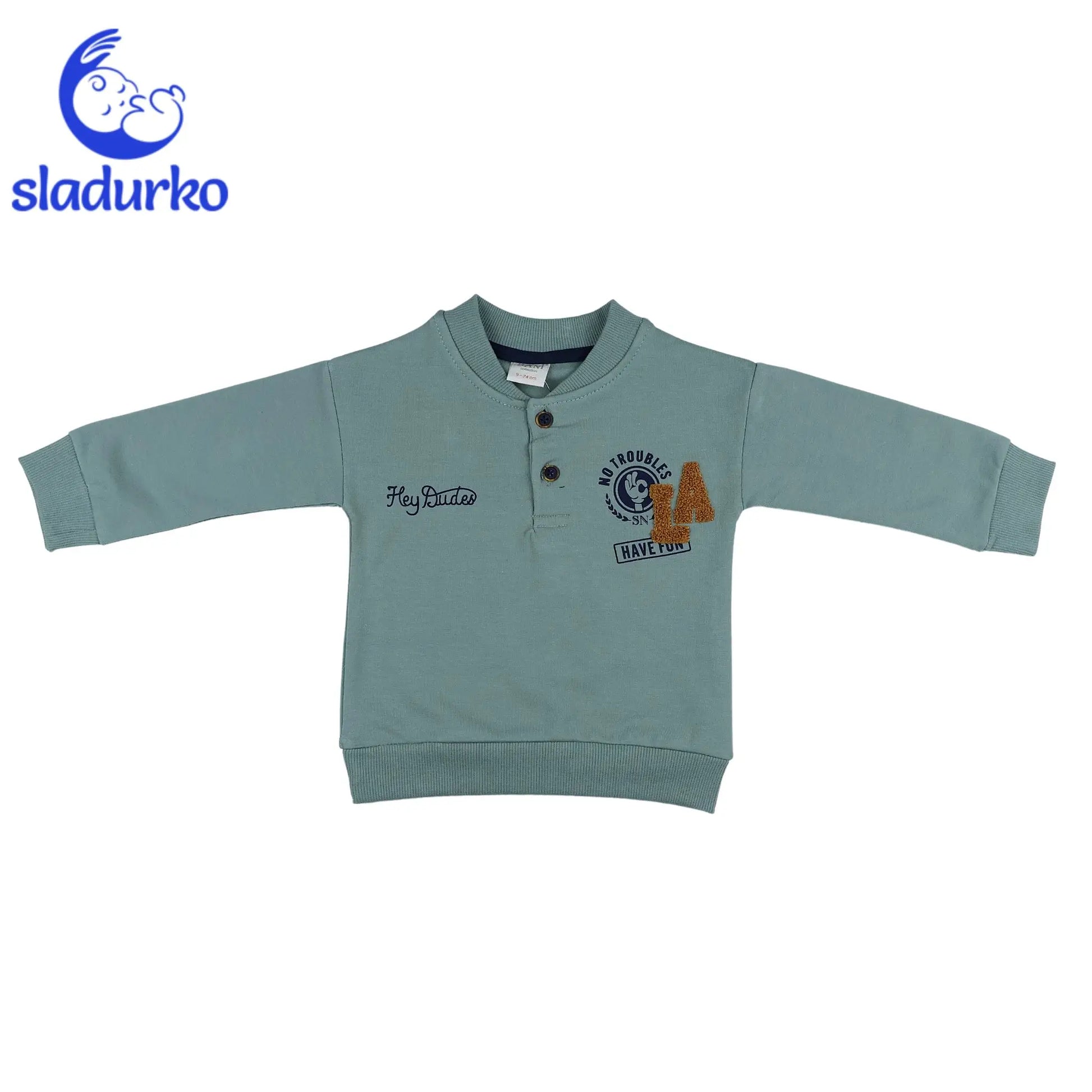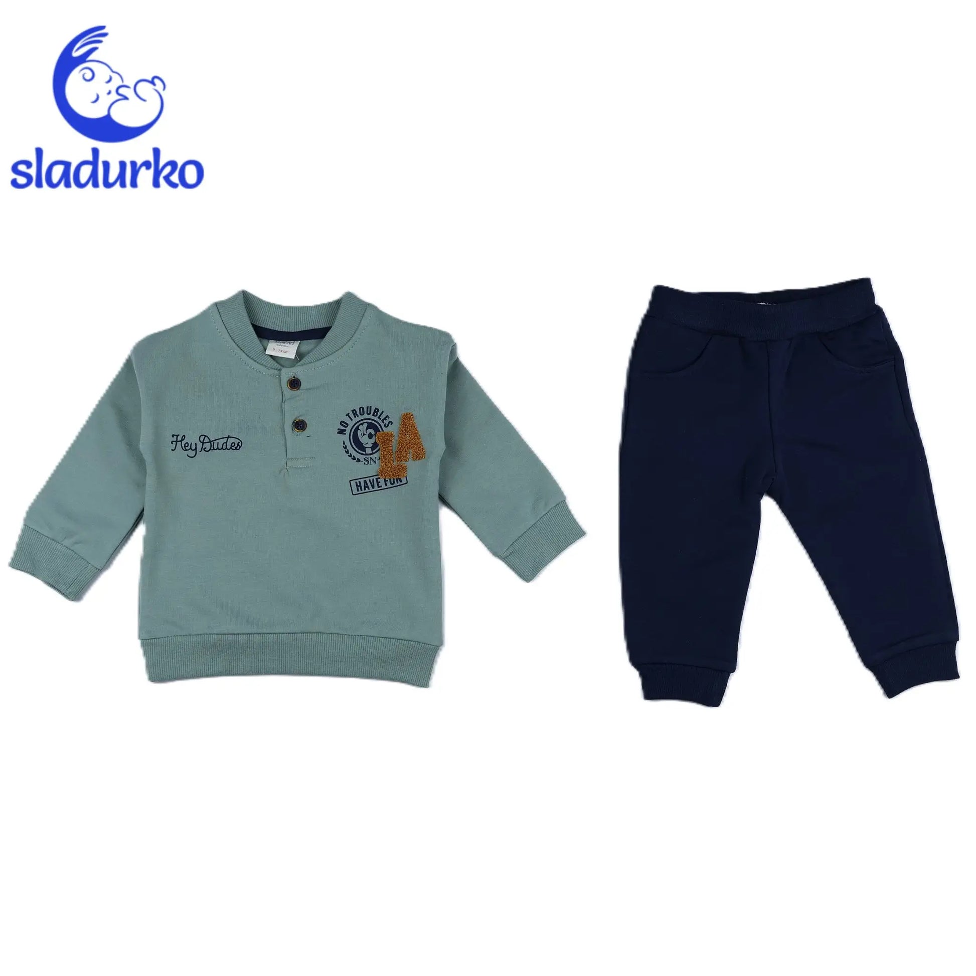 Стилен комплект за момче, състоящ се от зелена блузка и тъмносини панталони. Блузката е в свеж зелен цвят, добавящ жизненост и енергия, с удобна кройка, която осигурява комфорт през целия ден. Тъмносините панталони са класически и лесни за съчетаване, изработени от устойчива материя с еластичен колан за по-добро прилягане и свобода на движение. Този комплект е идеален както за ежедневни игри, така и за по-специални поводи, комбинирайки удобство и стил.