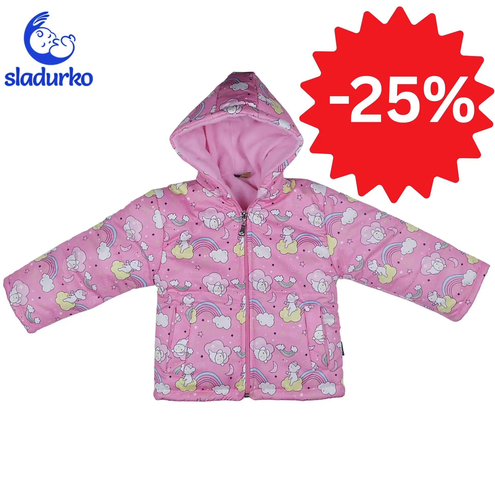 Основният розов цвят е украсен с вълшебен принт на облачета, звездички и дъги, превръщайки всяка разходка в приказно приключение. Розов цип и меката розова подплата на качулката и вътрешността добавят нежност и модерен акцент към якето.
