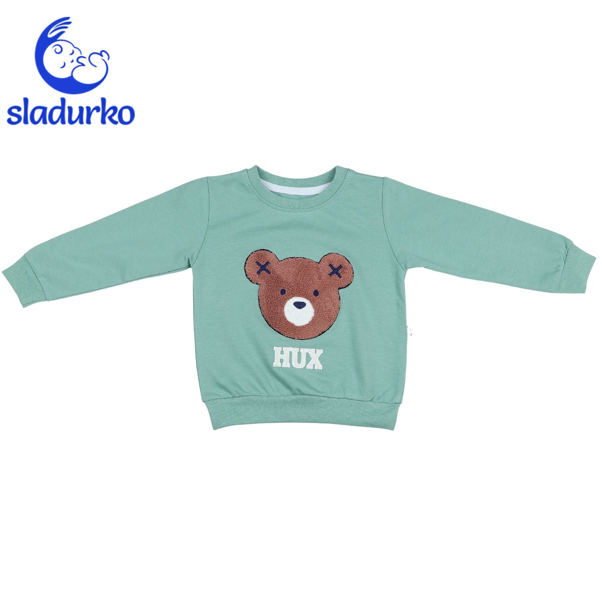 - Блуза: Елегантна зелена блуза с дълъг ръкав, изработена от мека и удобна материя. Декорирана е с избродирана апликация на меченце, което добавя закачлив акцент. Ластиците на ръкавите и долния ръб осигуряват комфорт при носене.
